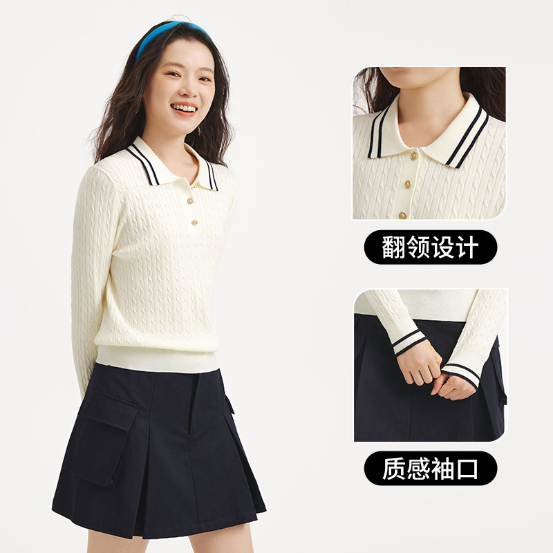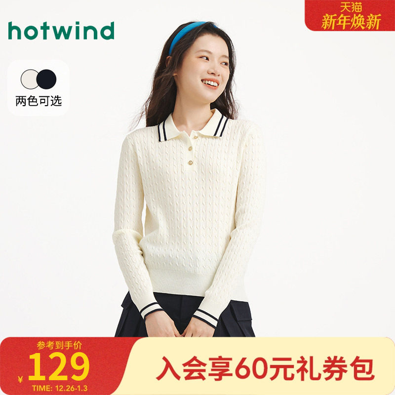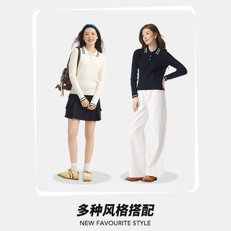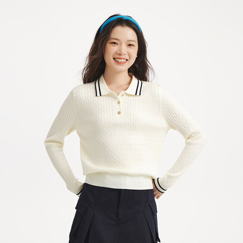 热风2025年秋季新款女士绞花翻领针织衫套头长袖上衣休闲居家舒适