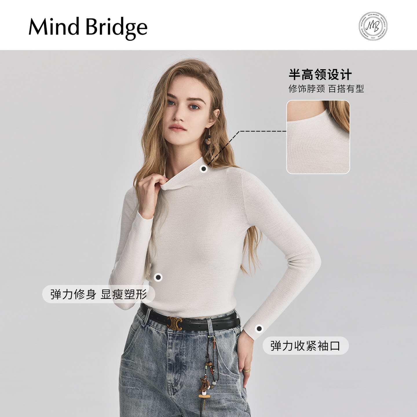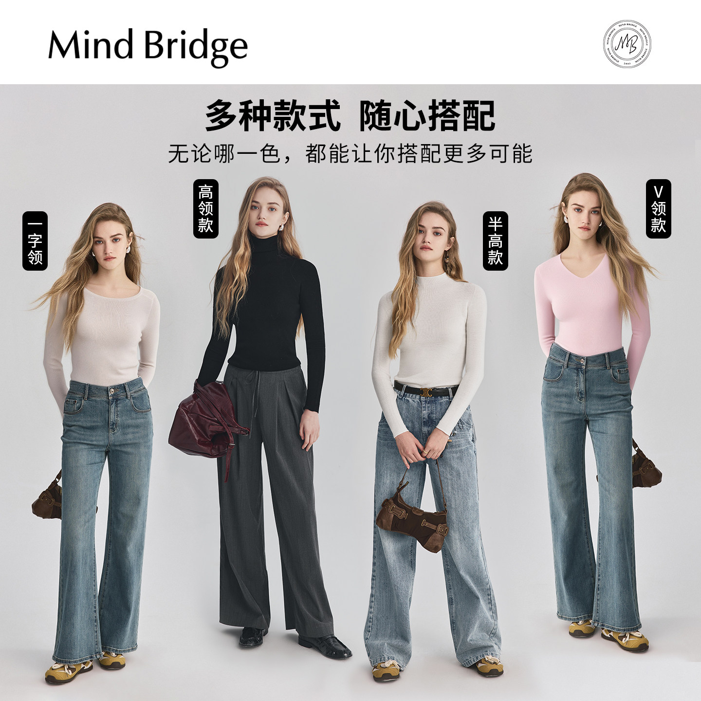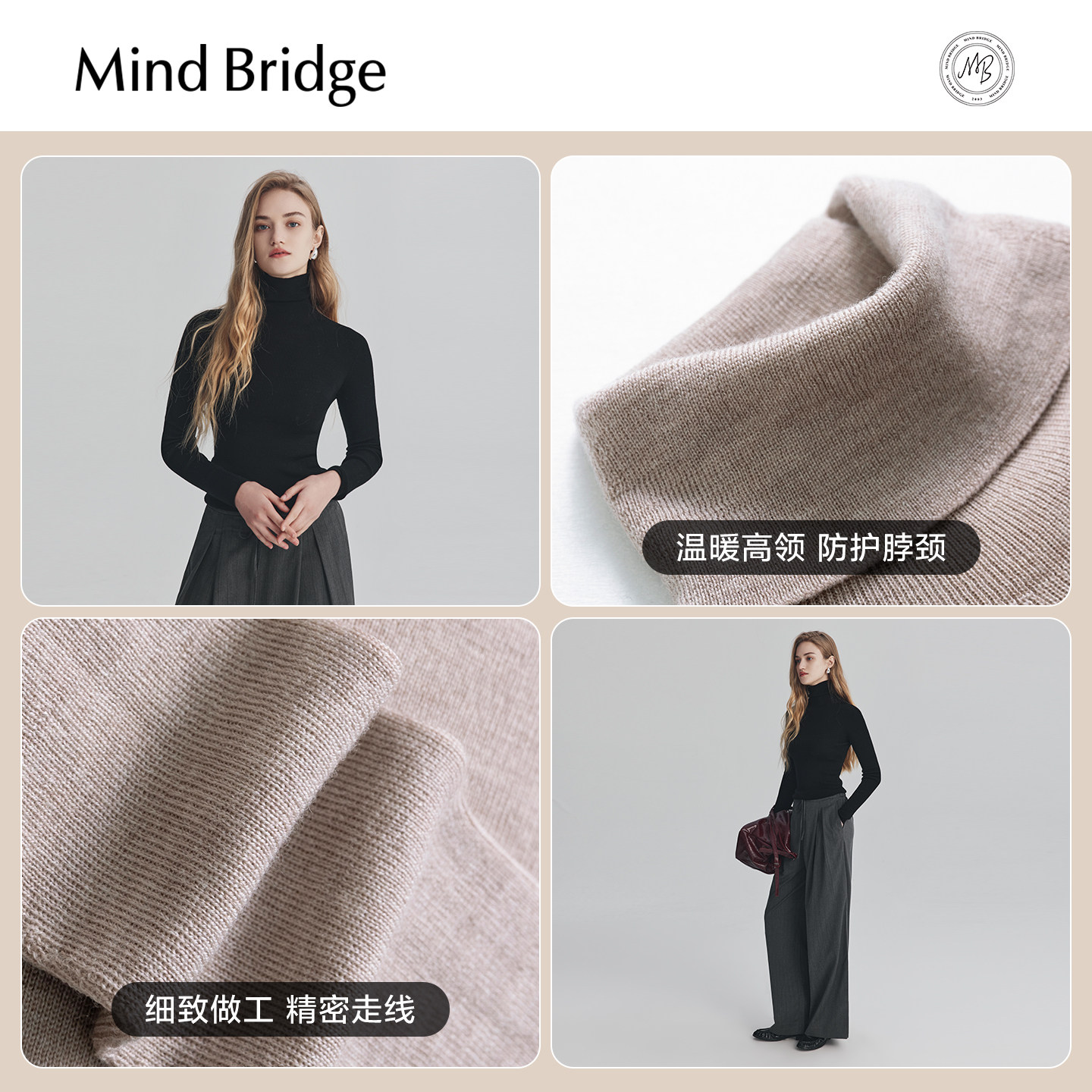 MindBridge【绵羊毛】女士圆领针织高领羊毛衫2025年秋一字领打底