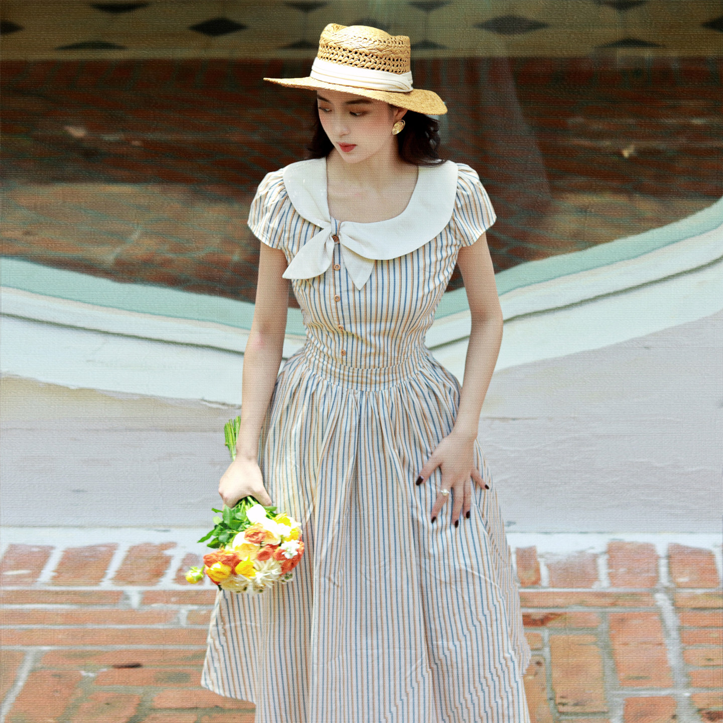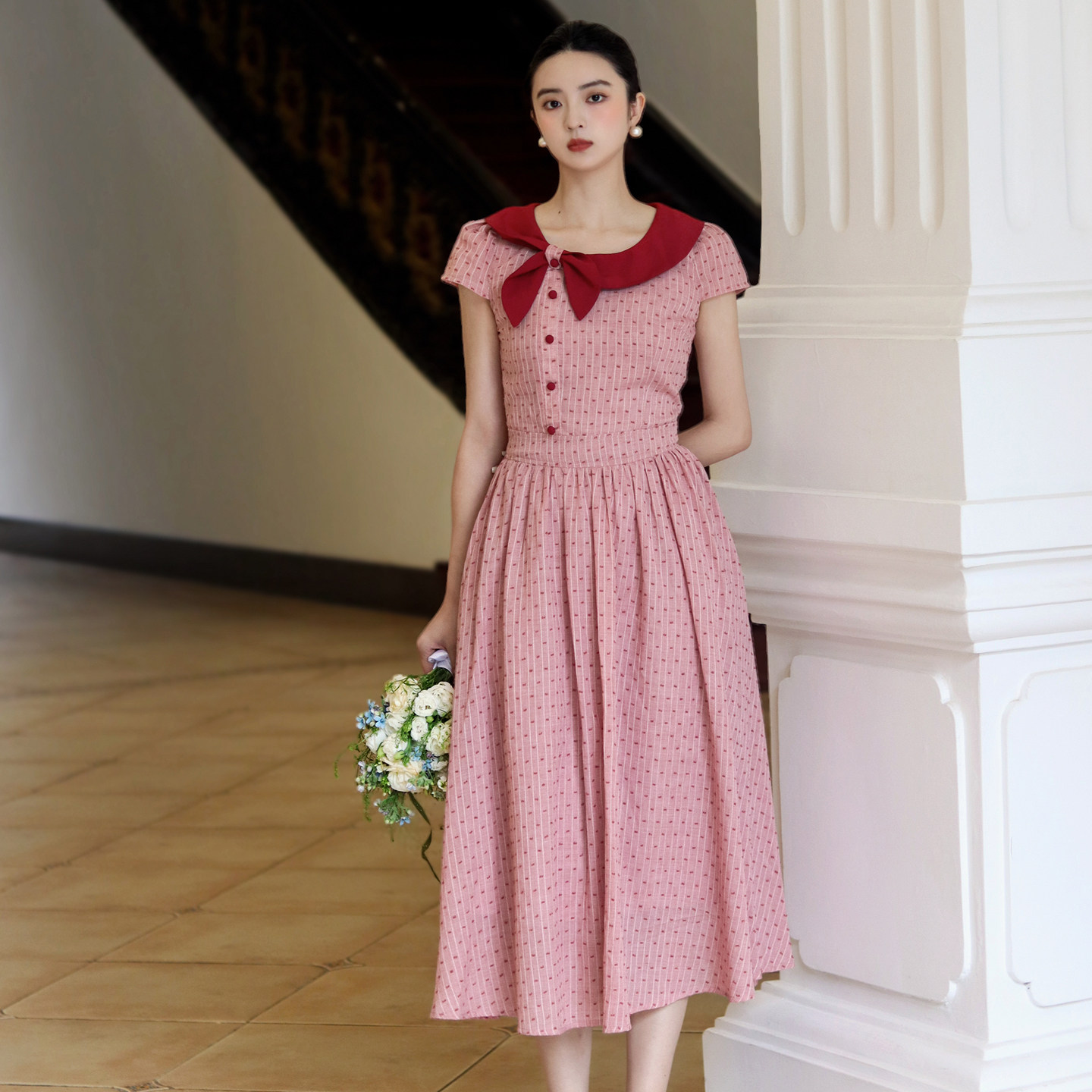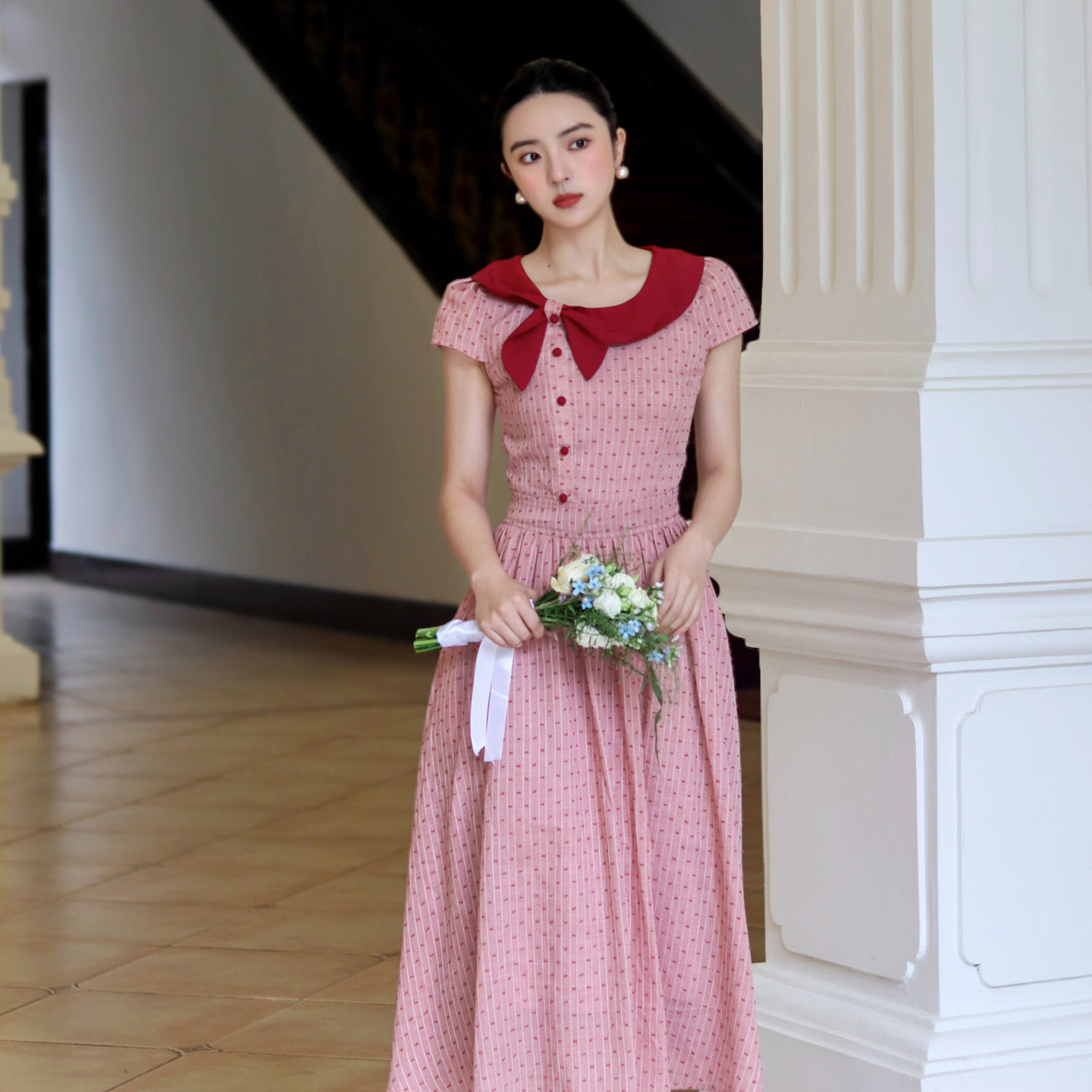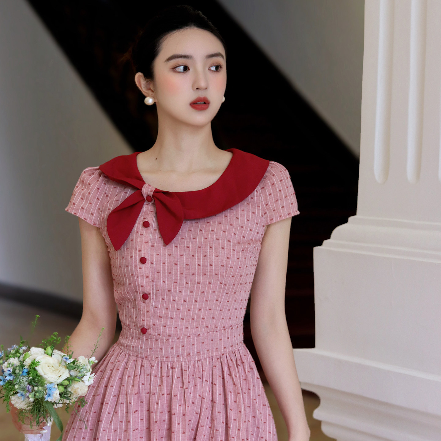 JUJU定制夏季新款法式复古娃娃领连衣裙设计感显瘦粉色裙子甜美女