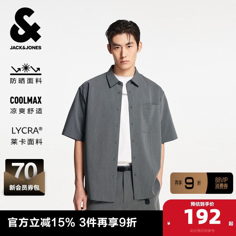 杰克琼斯男装夏季新款logo商务通勤休闲百搭纯色宽松短袖衬衫