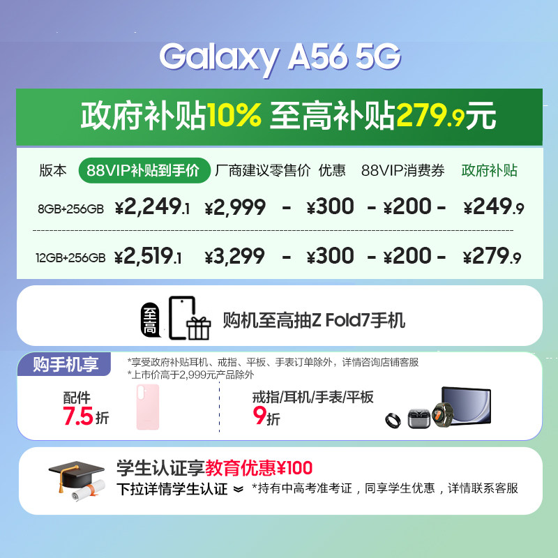 【88VIP共省749元】Samsung/三星 Galaxy A56 5G智能拍照手机官方旗舰店正品 设计轻薄时尚游戏手机