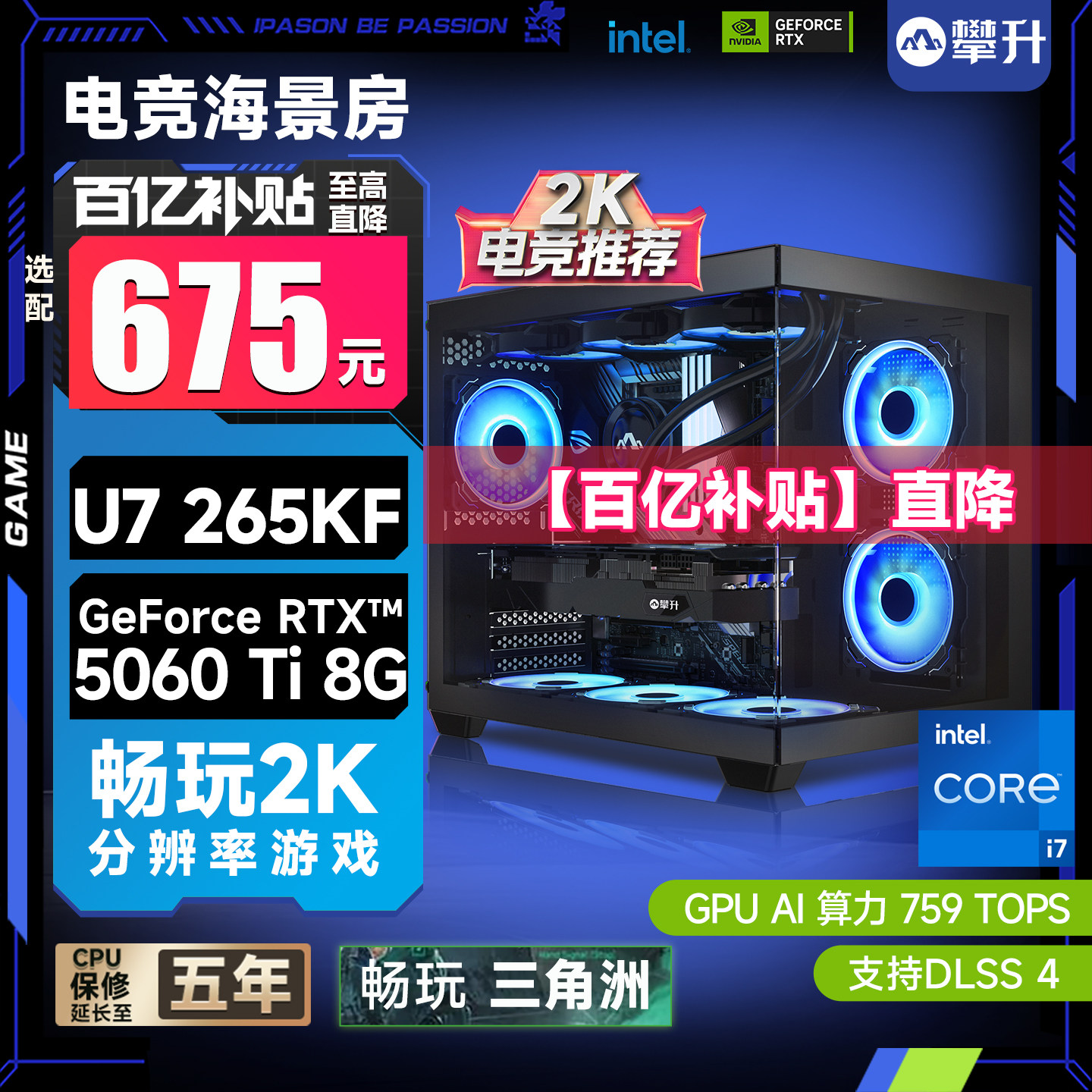 【百亿补贴】攀升台式电脑主机i5/i7/U7 265KF/华硕RTX5060/5070游戏设计整机台式电脑主机DIY装机组装台式机