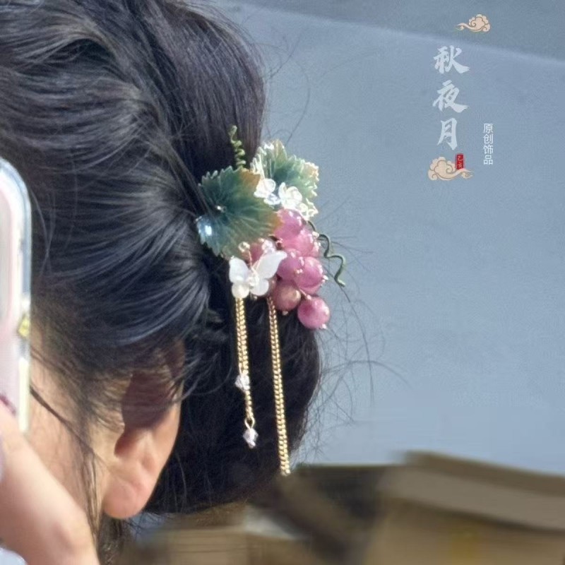 小葡萄发夹流苏发钗簪子唐风步摇古风百搭日常汉服头饰绿紫色发簪