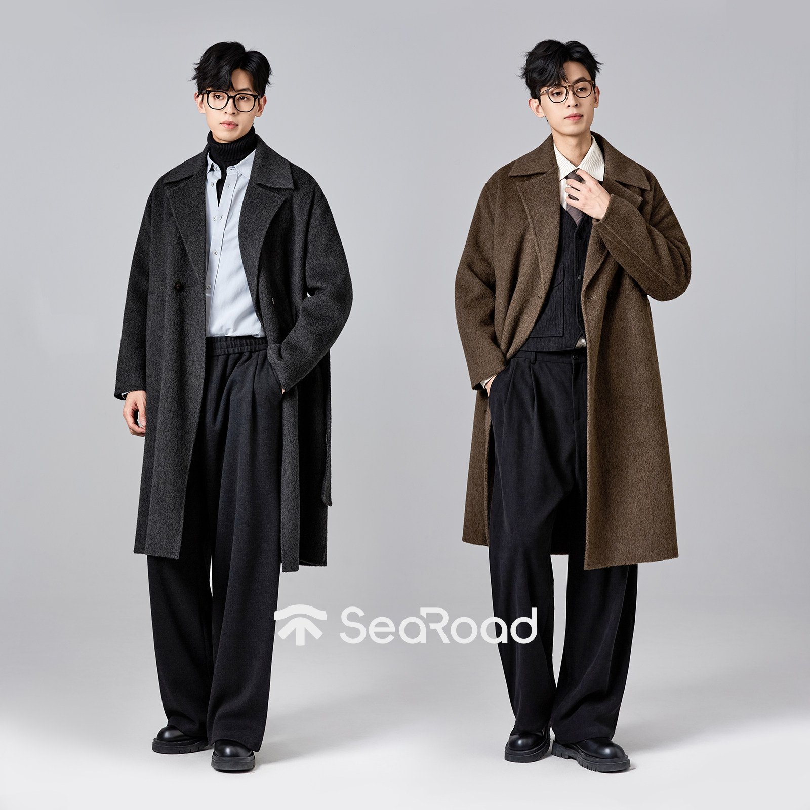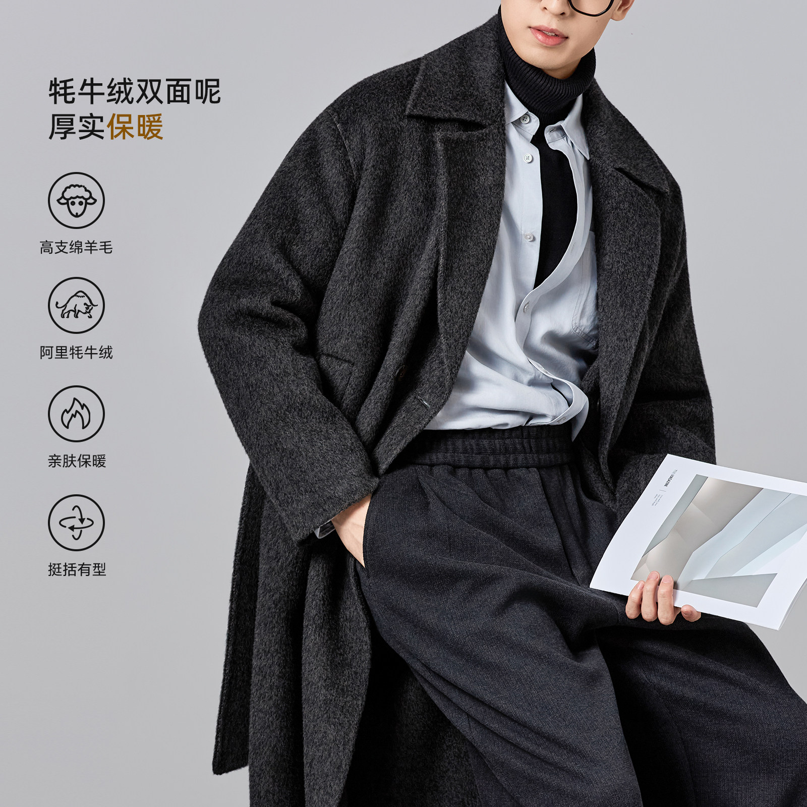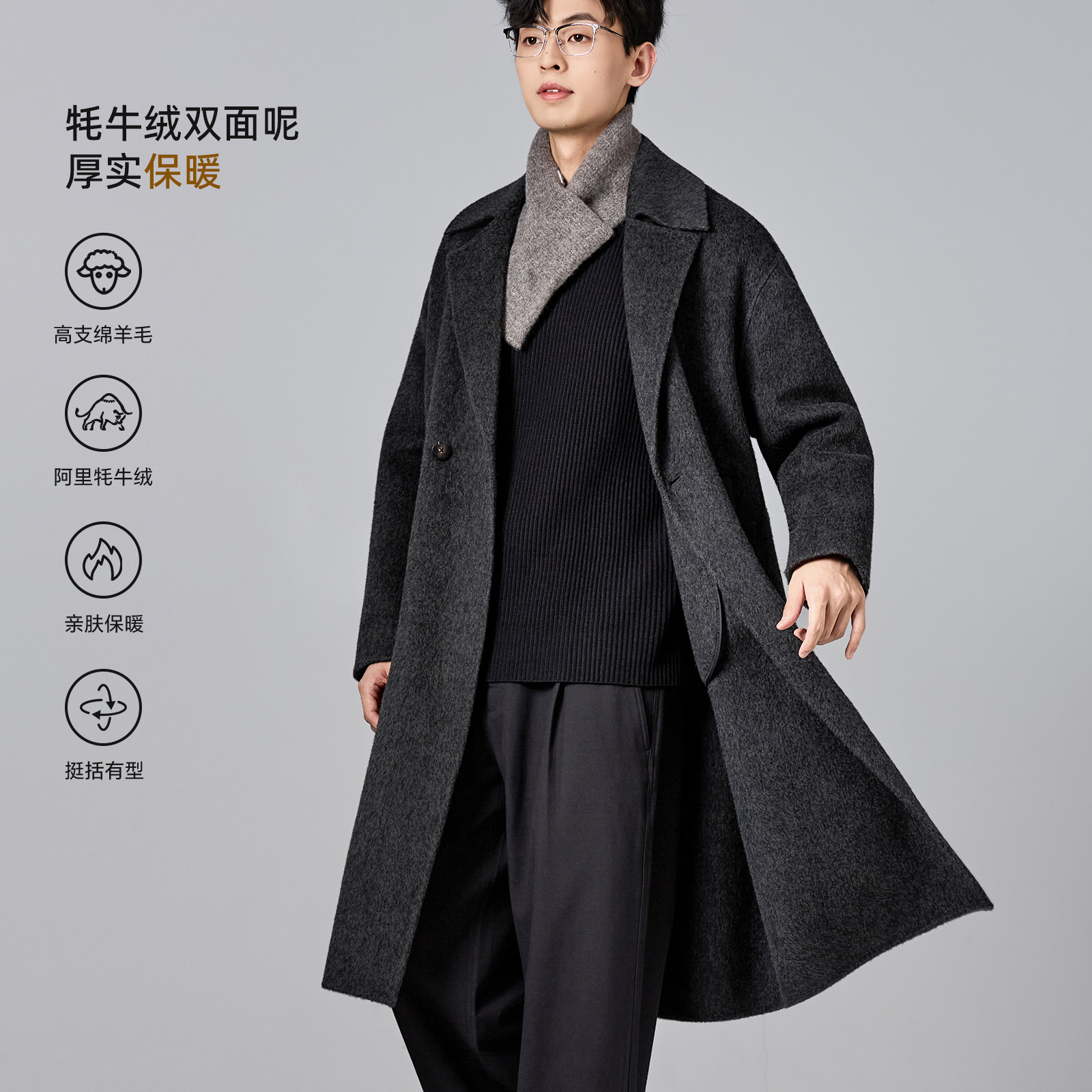 海上公路牦牛绒双面呢大衣男士秋冬季90羊毛气质长款风衣毛呢外套
