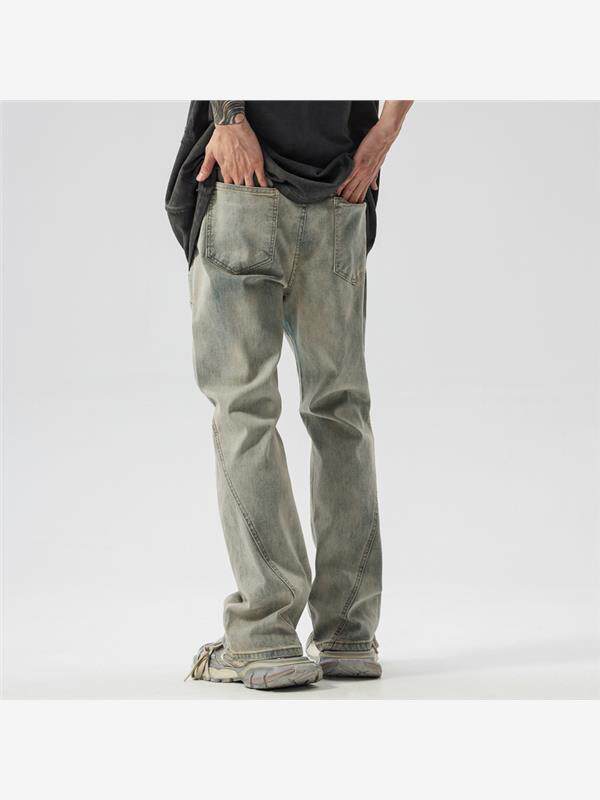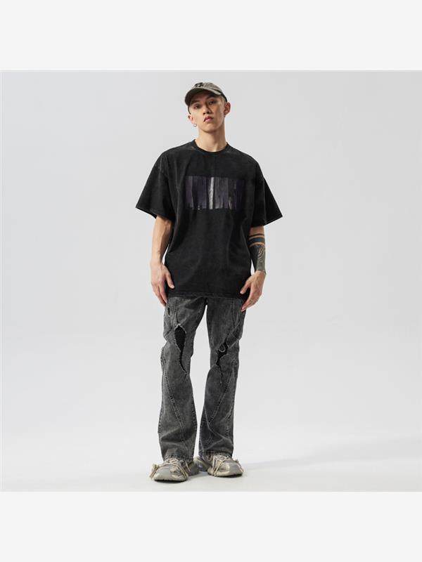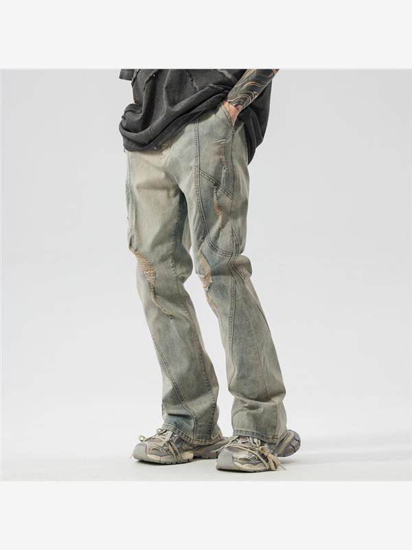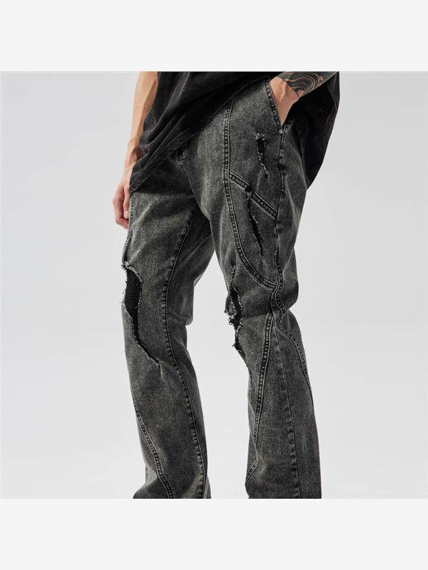 新因素复古牛仔裤做旧折条网纱破洞线条分割设计宽松直筒裤子男款