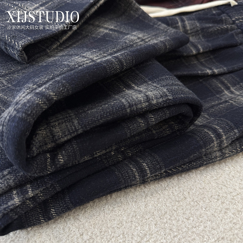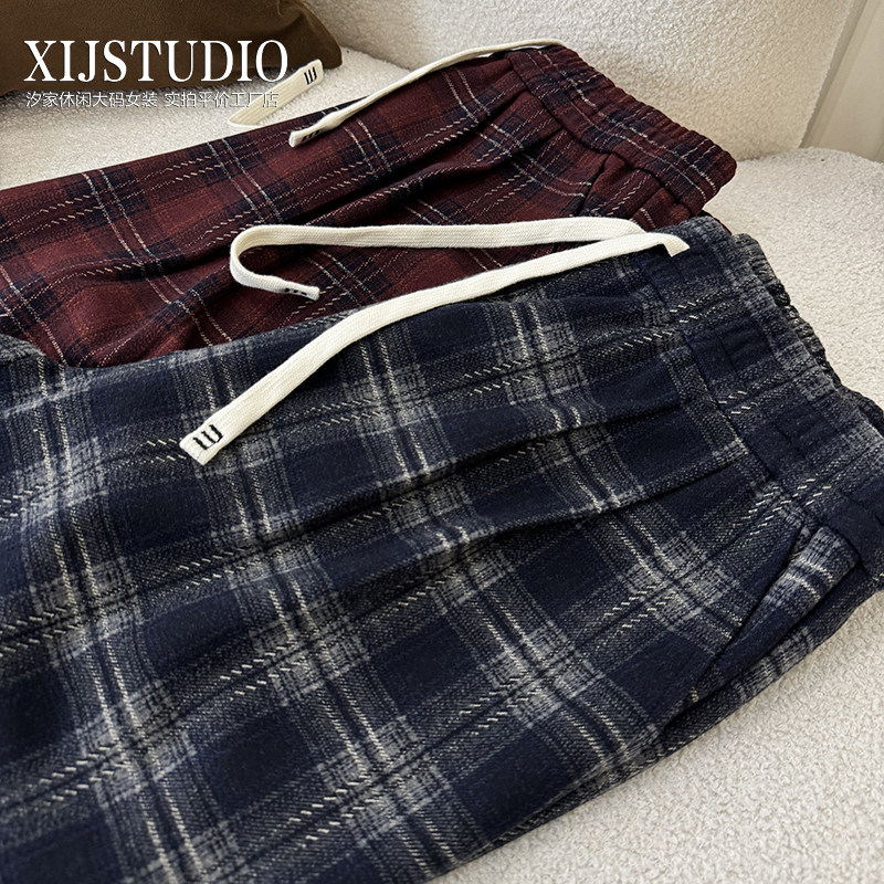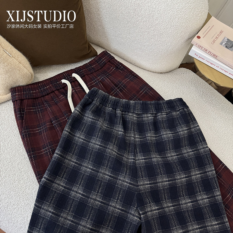 汐家女裤 秋冬松紧高腰提花格子休闲裤大码微弹直筒阔腿裤长裤