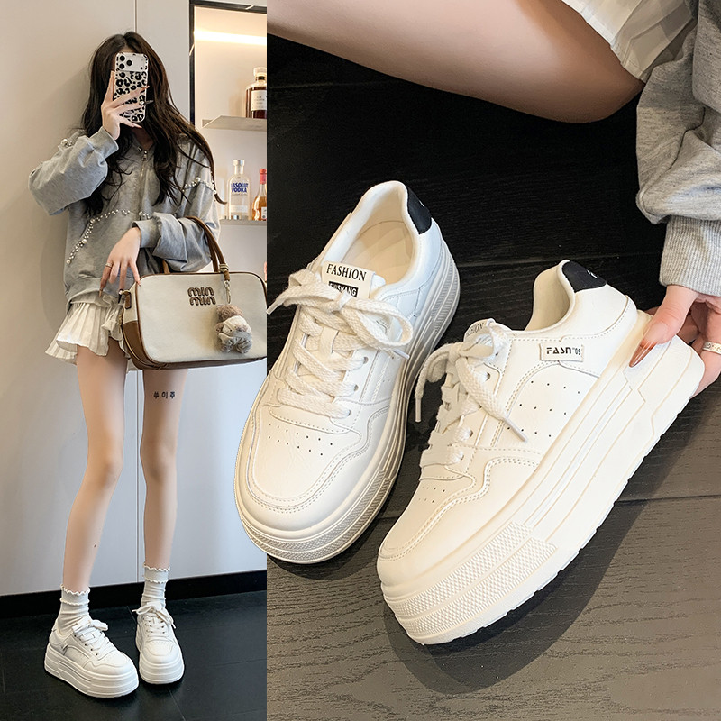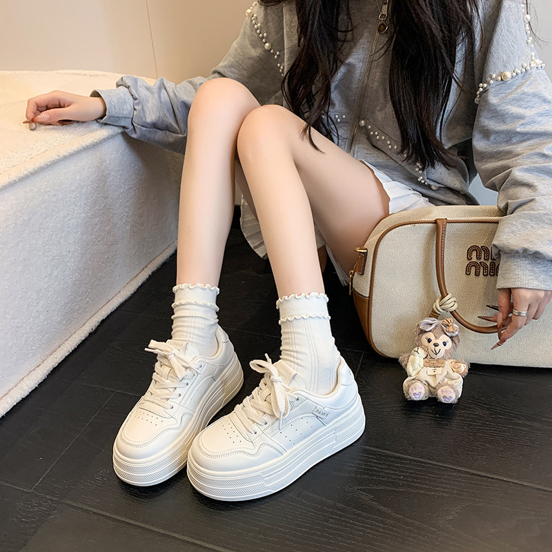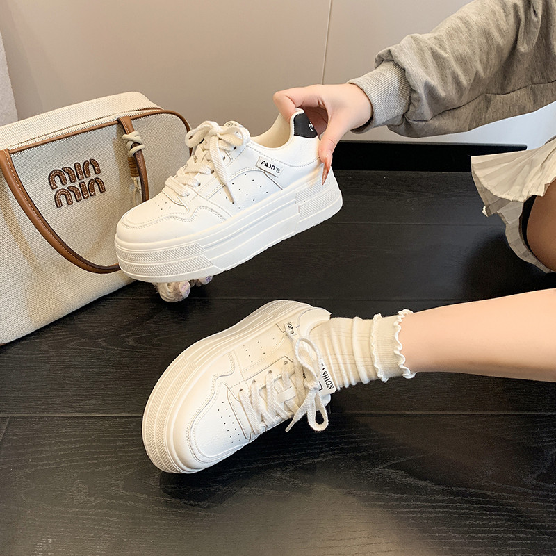 休闲风厚底小白鞋女系带百搭增高板鞋松糕鞋日常圆头学生休闲鞋子