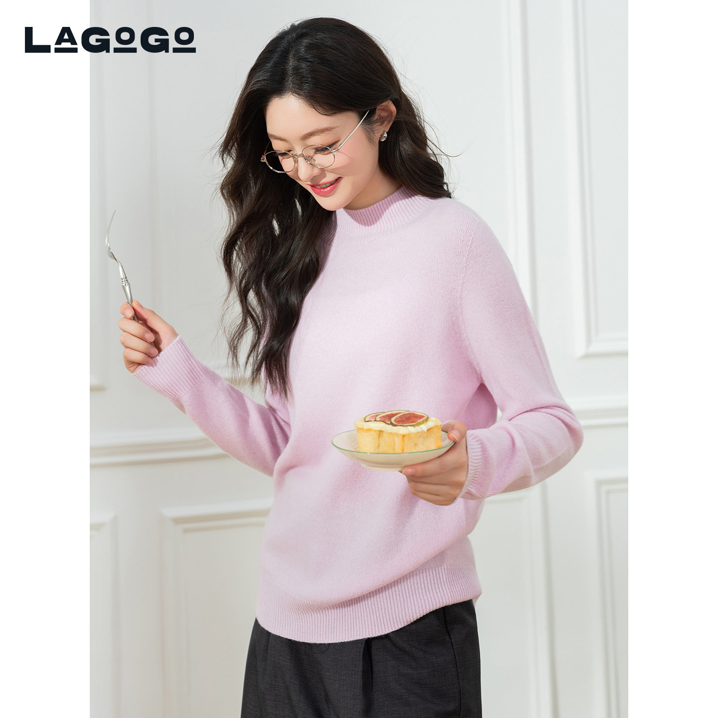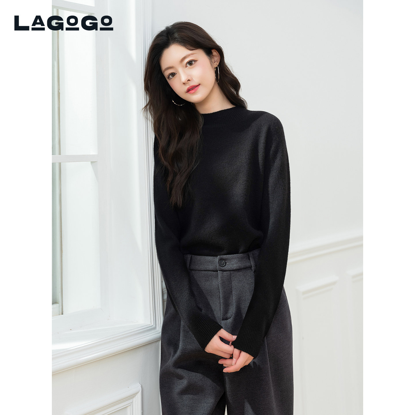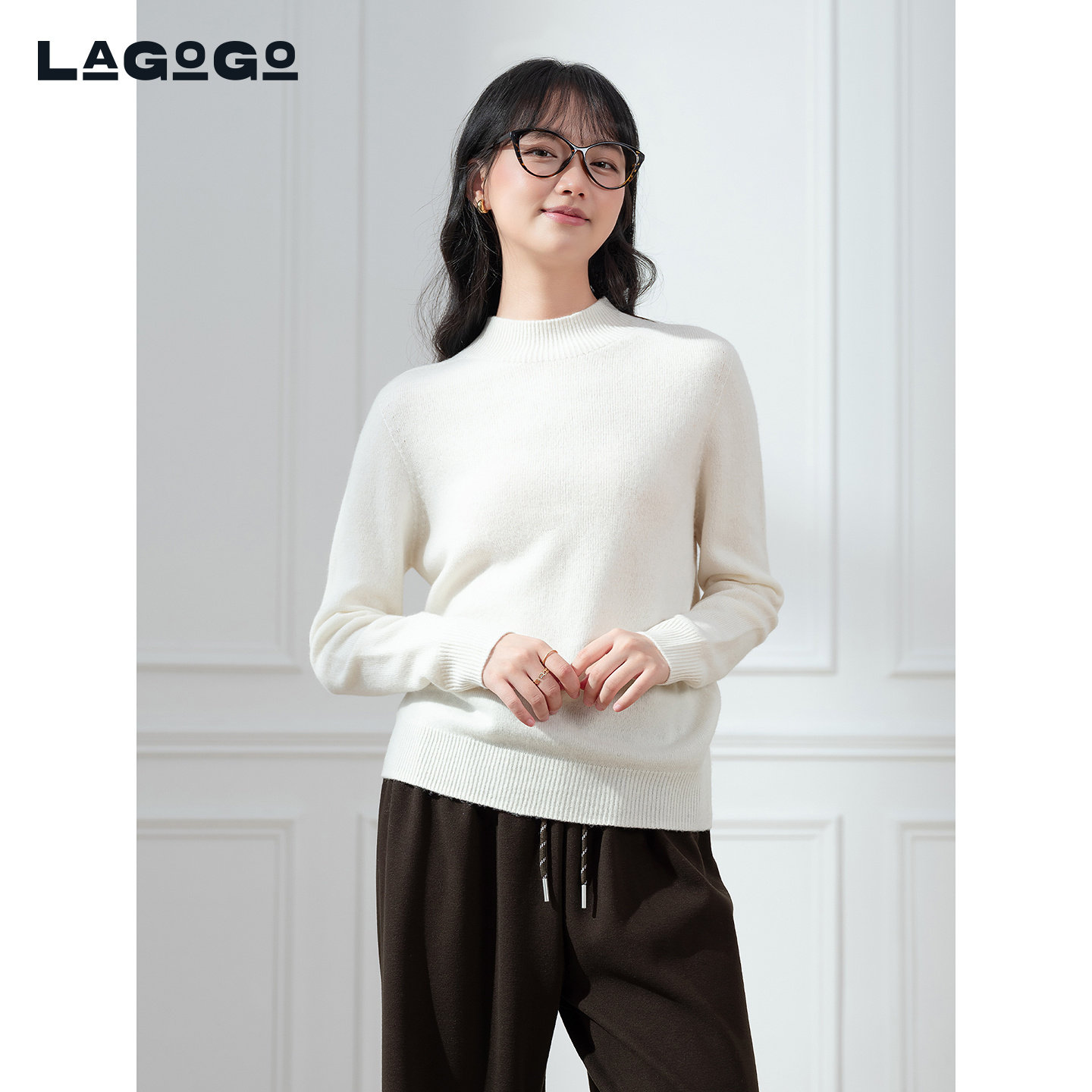 LAGOGO半高领纯色打底羊毛针织衫女拉谷谷2025冬款毛衣ODMM43XA64