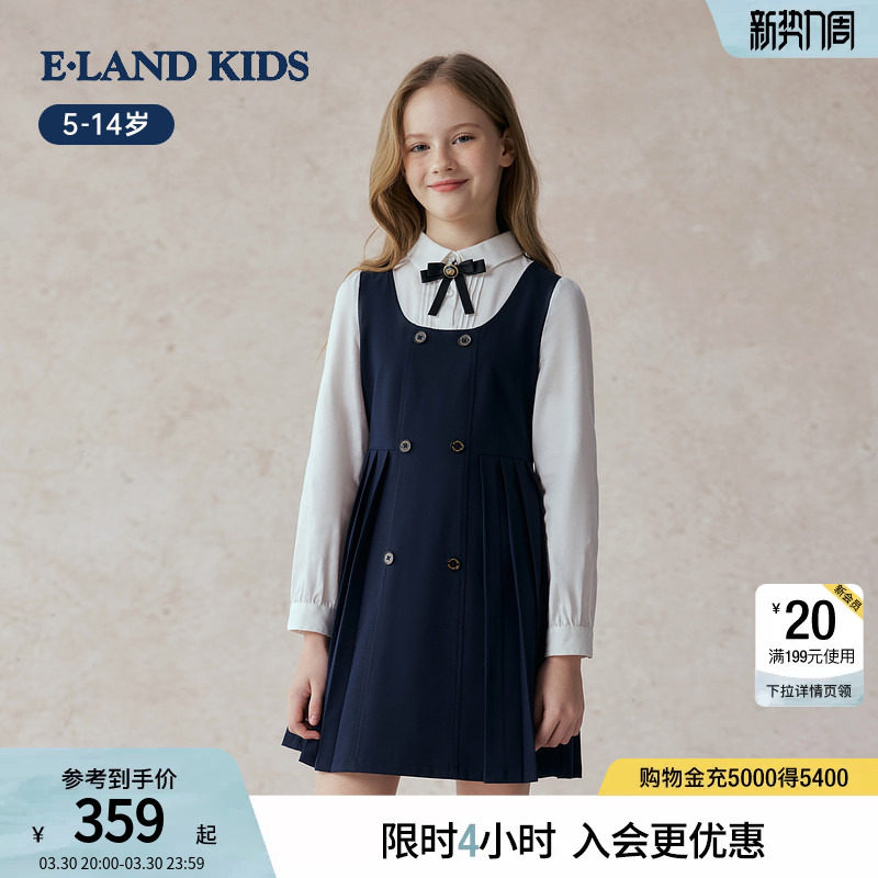 eland kids衣恋童装女童连衣裙春秋季裙子假两件礼服蝴蝶结演出服