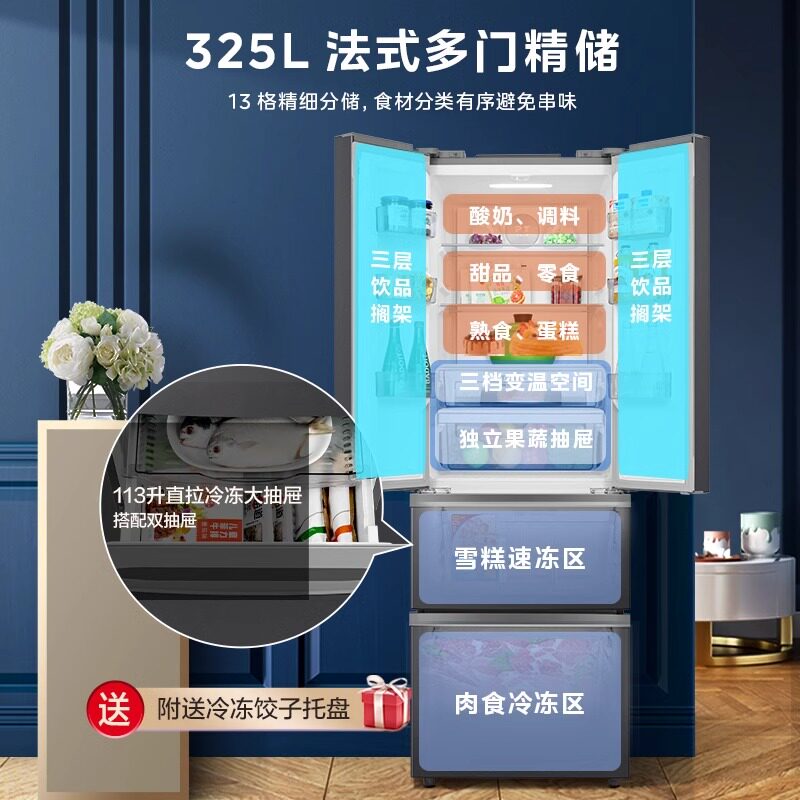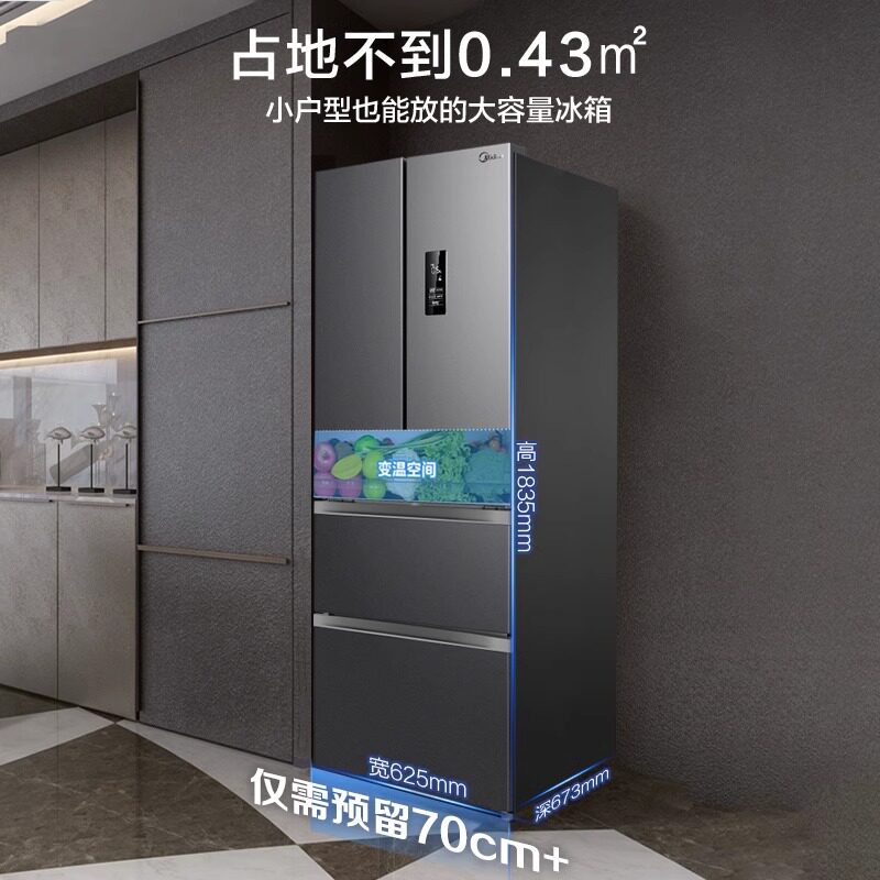 美的325升法式双开四门电冰箱家用一级能效小户型出租房风冷无霜