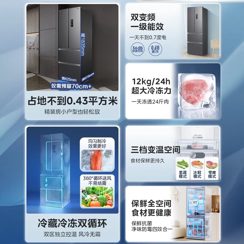 政府补贴海尔出品统帅345L彩晶法式四门多门一级小型家用冰箱官方