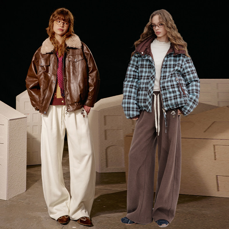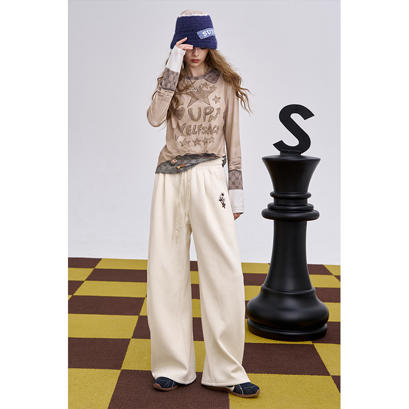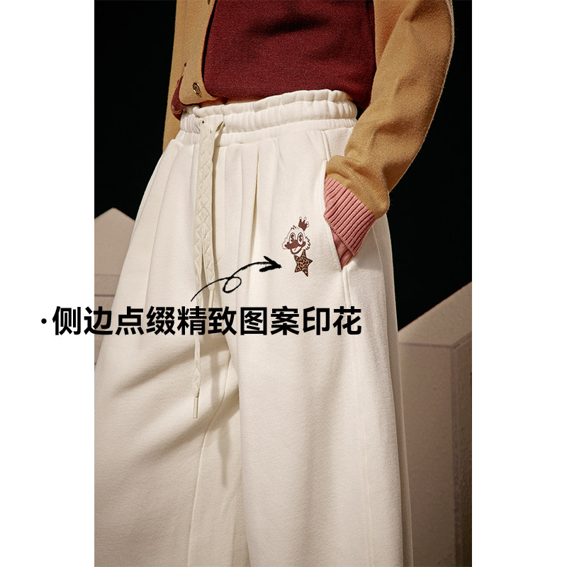 妖精的口袋复古咖色印花阔腿休闲裤女2025年秋冬新款慵懒风运动裤