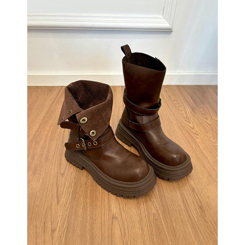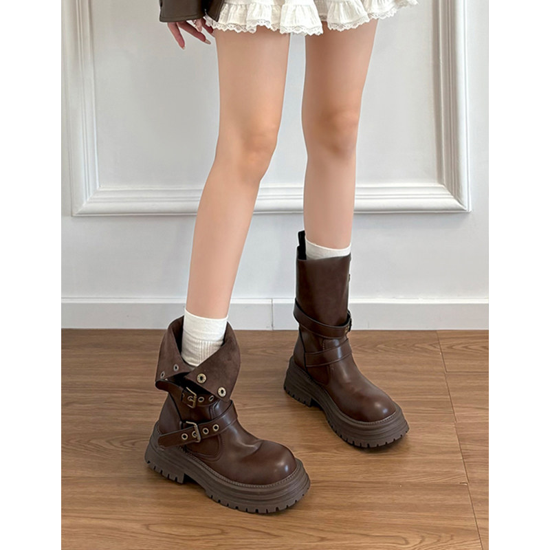 牛皮版~真皮厚底美拉德中筒短靴女2025新款英伦风棕色马丁靴中跟