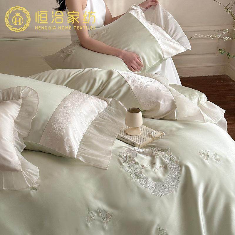 春夏季凉感莱赛尔四件套小清新刺绣提花韩系花边丝滑被套床品绿色