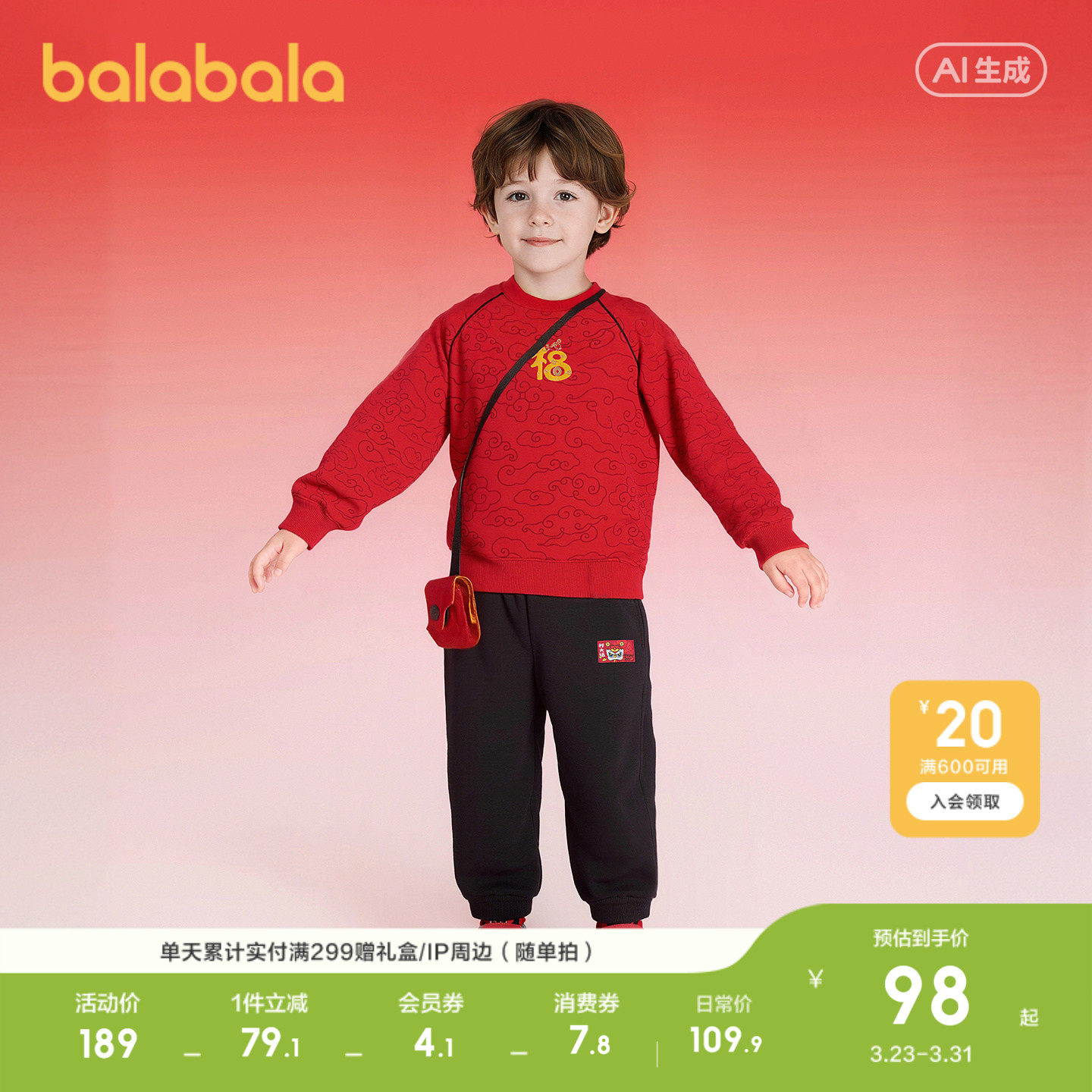 巴拉巴拉童装儿童套装男童春装国风两件套新年印花拜年服时尚休闲
