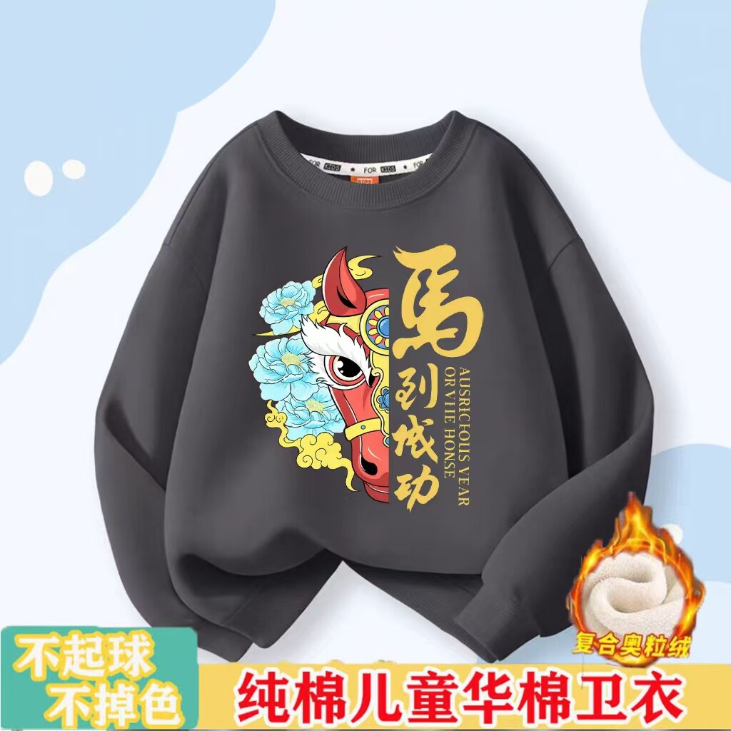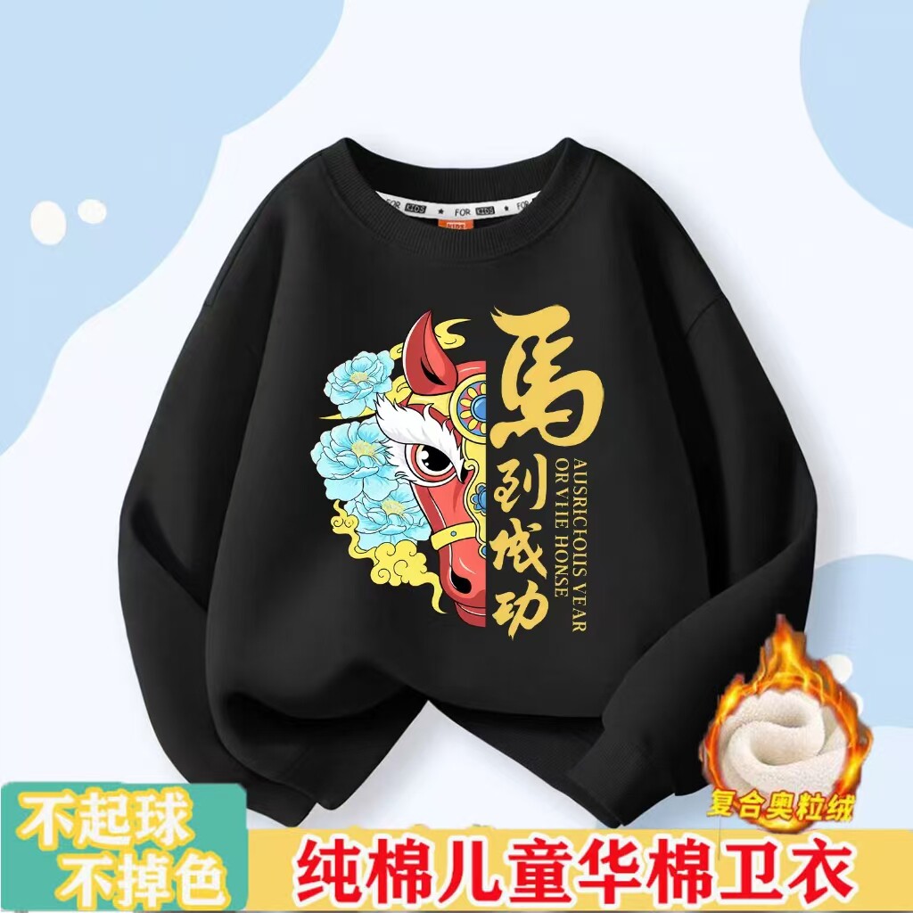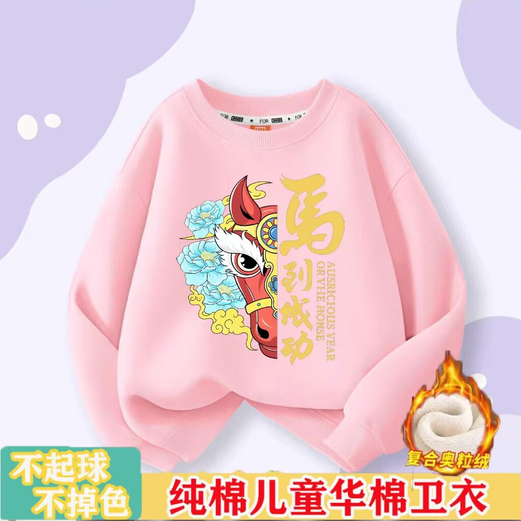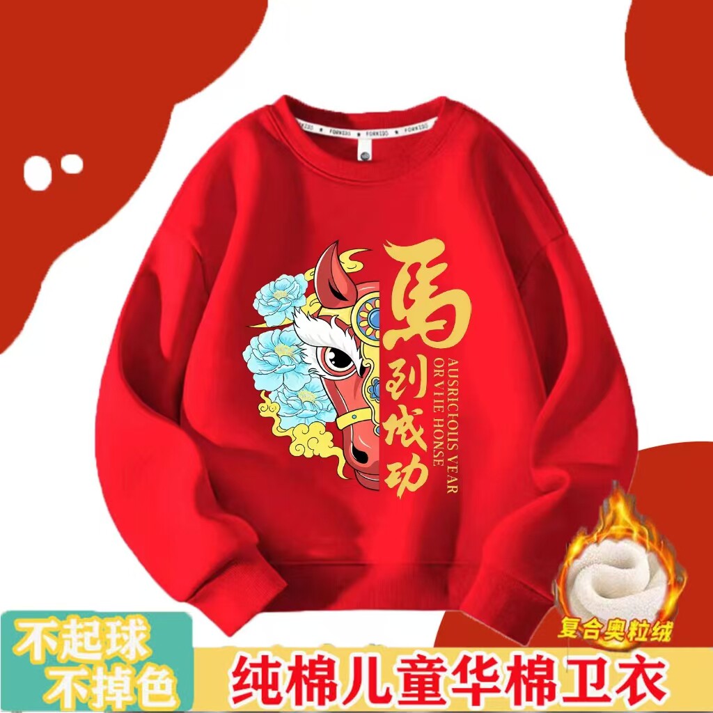 马年儿童卫衣国潮风可爱卡通小马男童秋冬女童红色加绒宝宝班服潮
