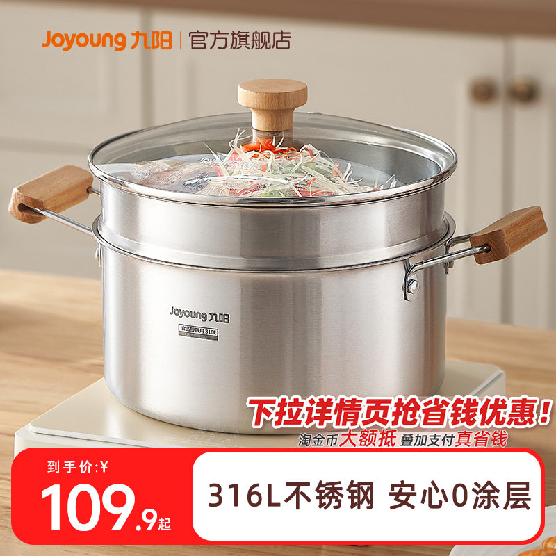 九阳食品级不锈钢汤锅家用加厚煮粥小煮锅蒸煮锅电磁炉燃气灶炖锅