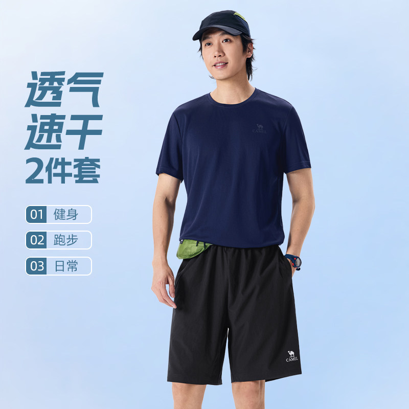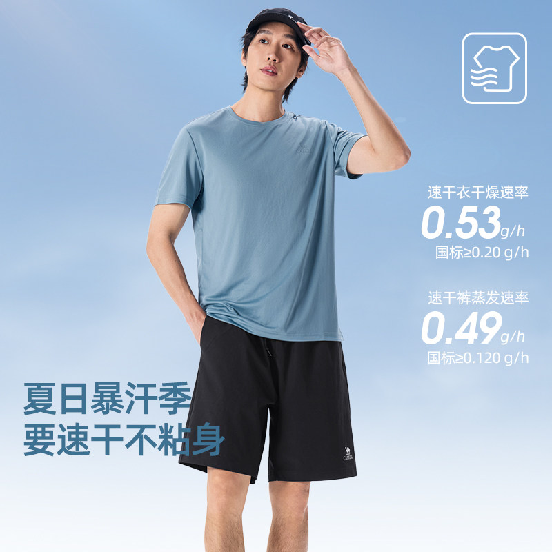 骆驼男装短裤男春季2026休闲薄款速干短袖T恤透气运动套装女