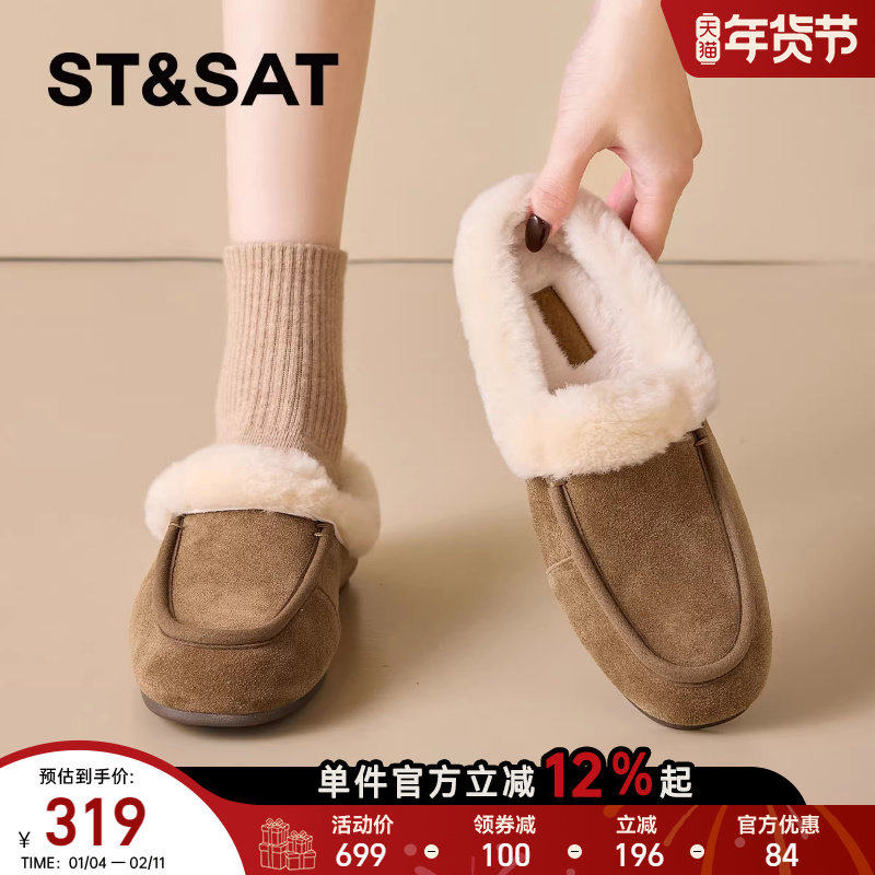 星期六毛毛鞋女款冬季加绒保暖2025新款乐福女鞋平底棉鞋豆豆鞋子