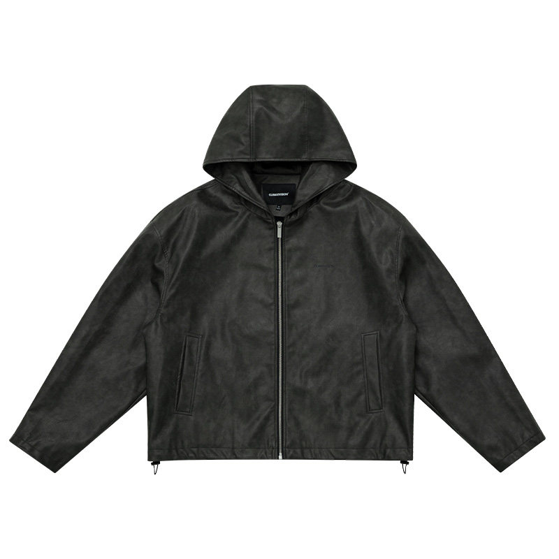 CLIMAX VISION刺绣logo美式复古PU皮连帽拉链夹克皮衣