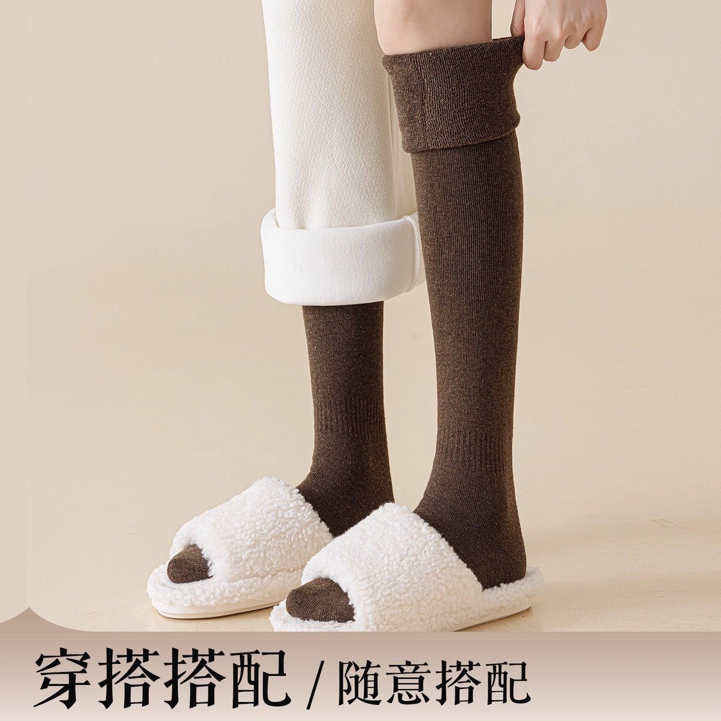 加绒厚袜子秋冬款加厚女毛圈潮款高筒纯色保暖拼接冬天长袜中筒袜