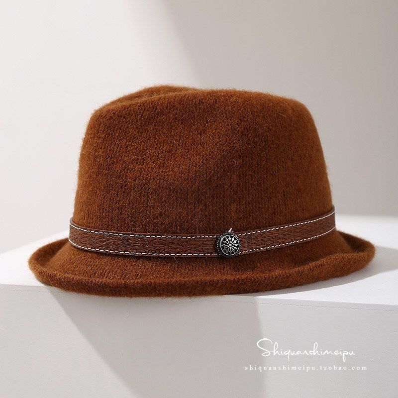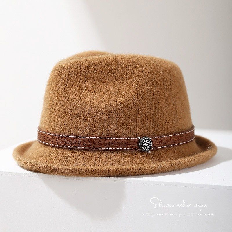 春秋羊毛礼帽出游女爵士帽英伦复古皮带扣羊绒针织卷边盆帽毛呢帽
