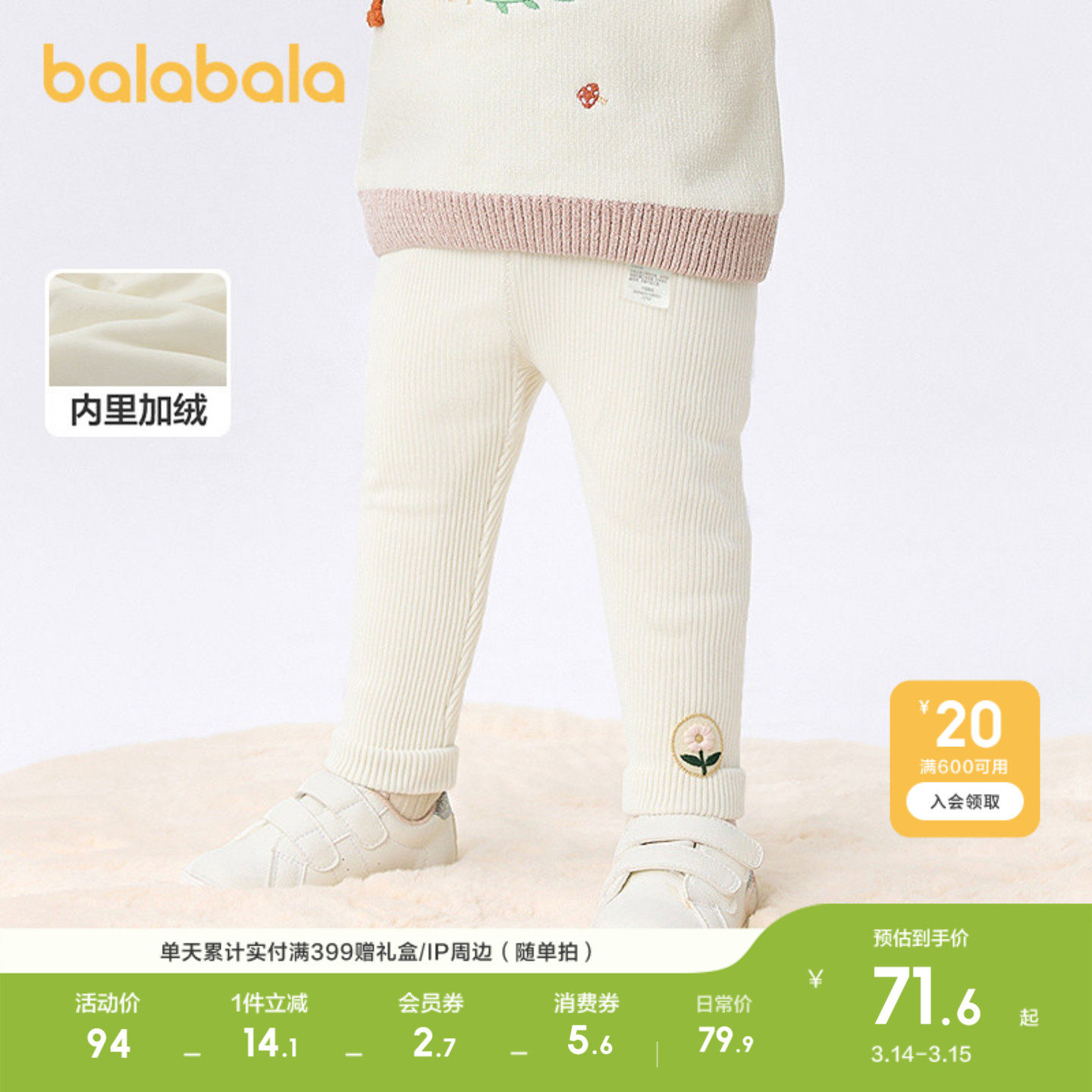 巴拉巴拉童装婴儿长裤加绒打底裤女童宝宝裤子2026秋冬装休闲保暖