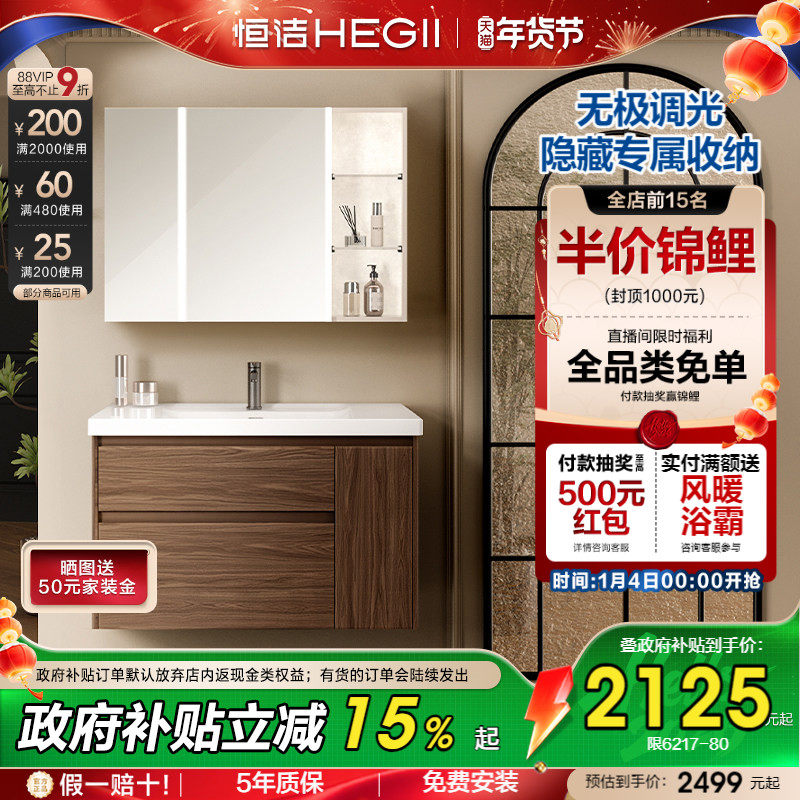 恒洁卫浴中古风浴室柜组合卫生间洗手台智能镜柜陶瓷一体盆