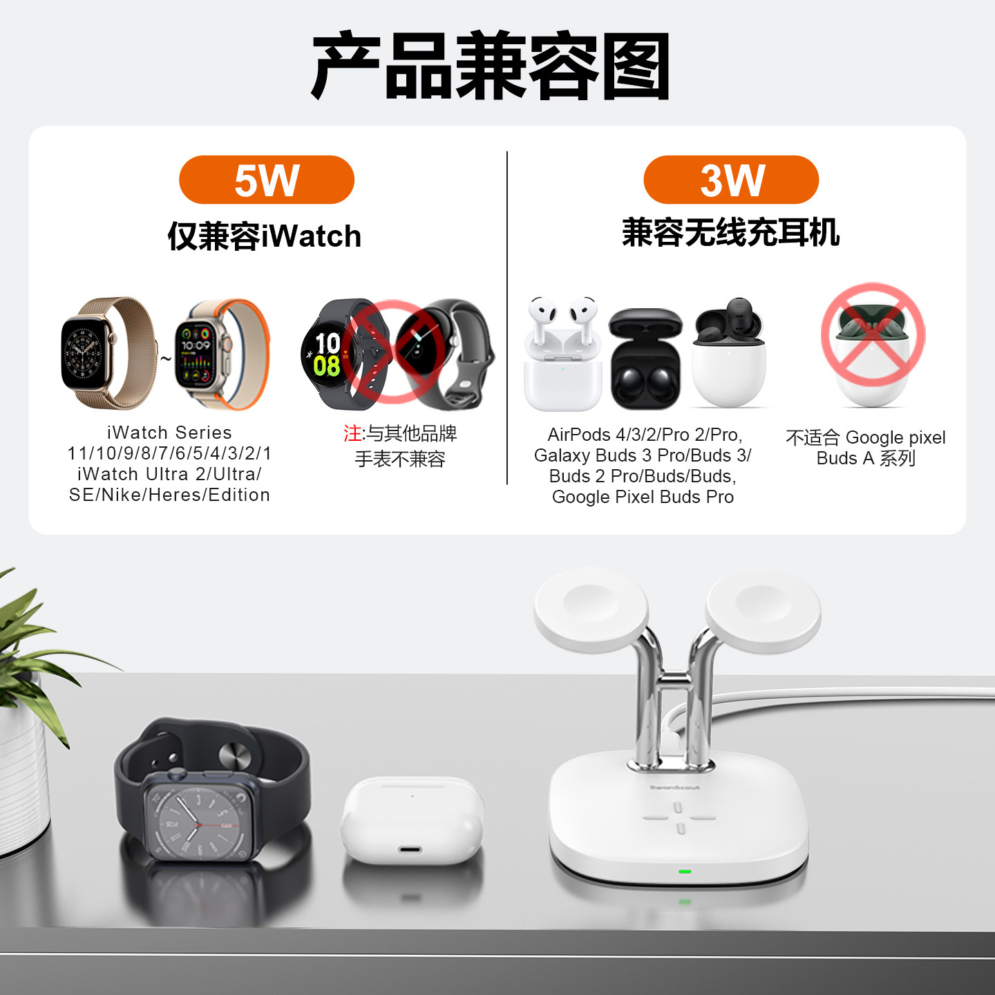白鹄SwanScout704A 双手表无线快充 兼容苹果Apple Watch S1-S11/SE+AirPods 三合一支架 立式便捷无线充电器