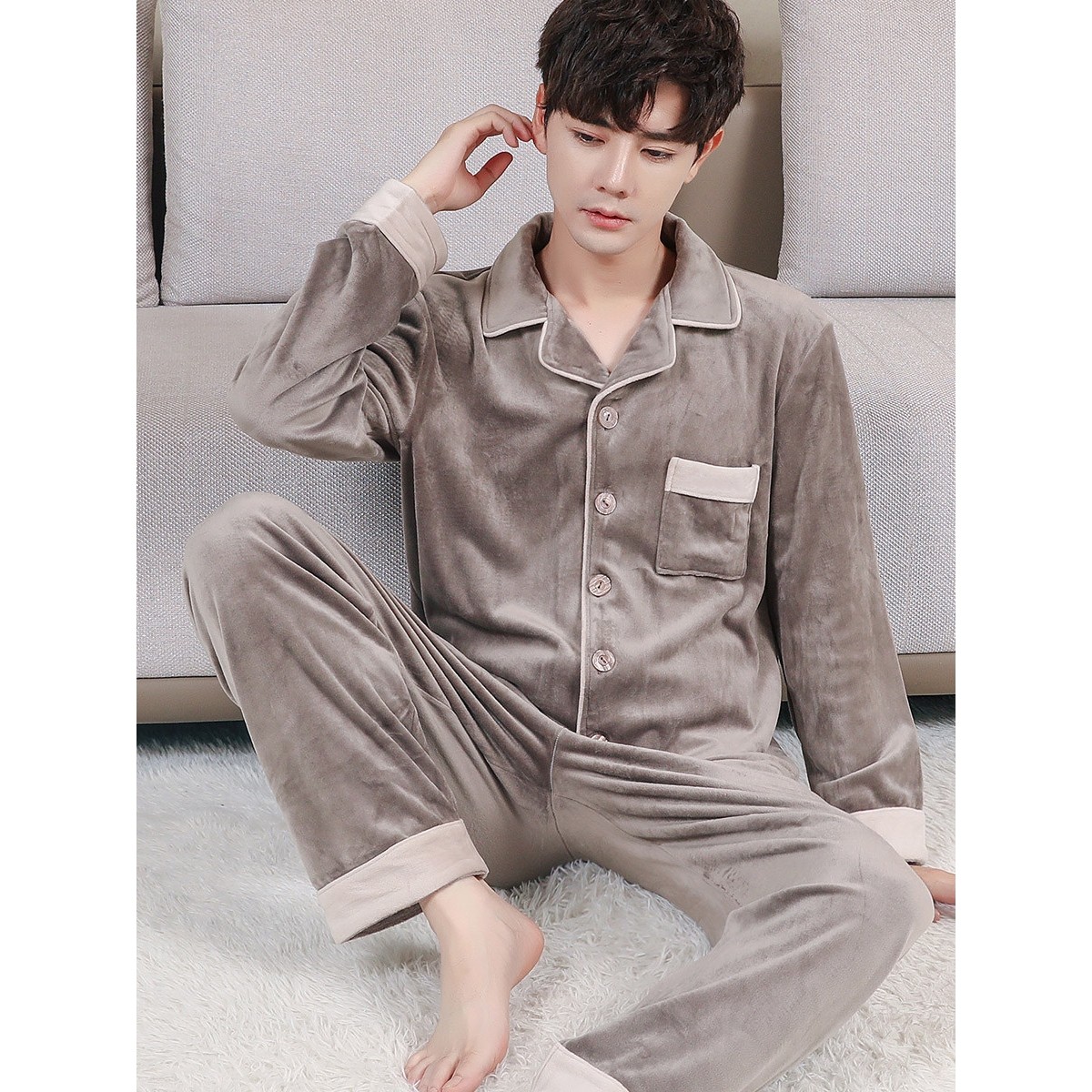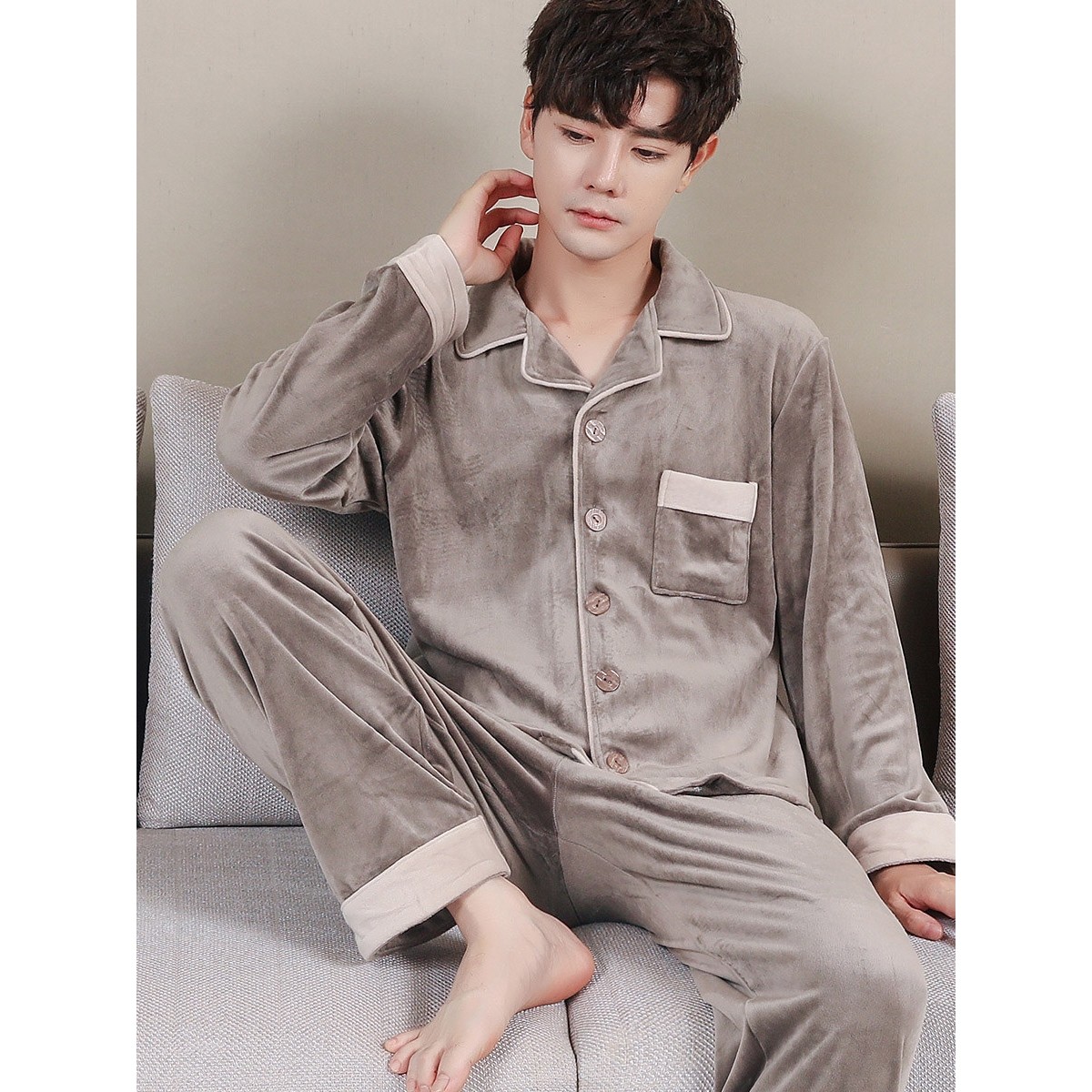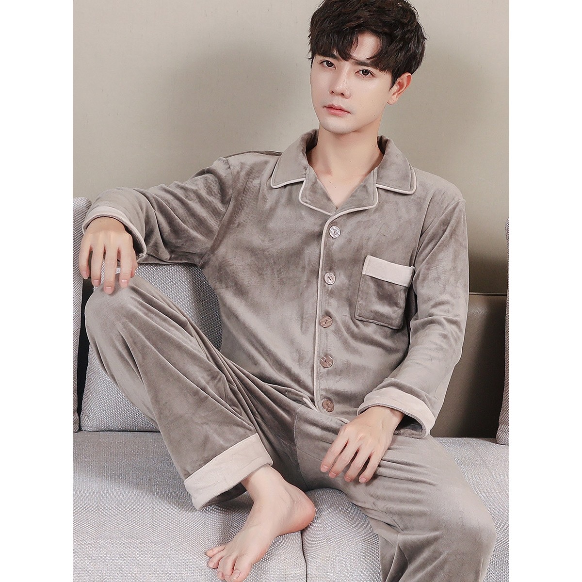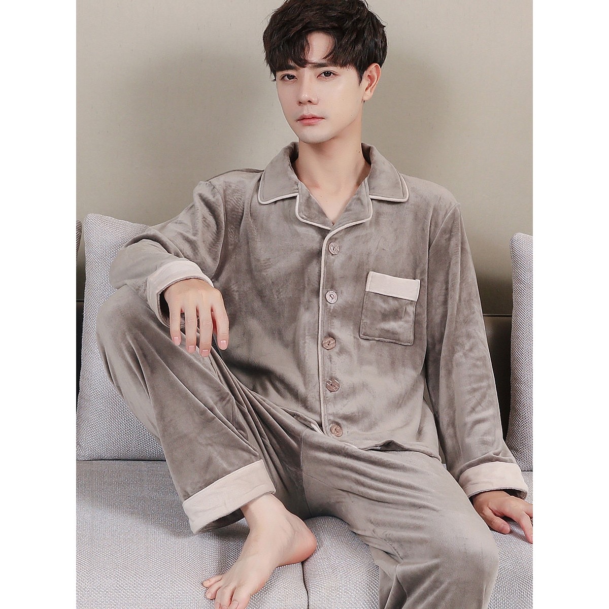 红豆珊瑚绒长袖加厚保暖秋冬男士睡衣套装春秋薄绒海岛绒可外穿家