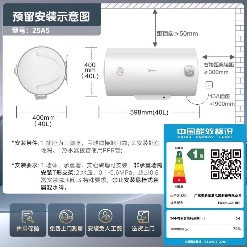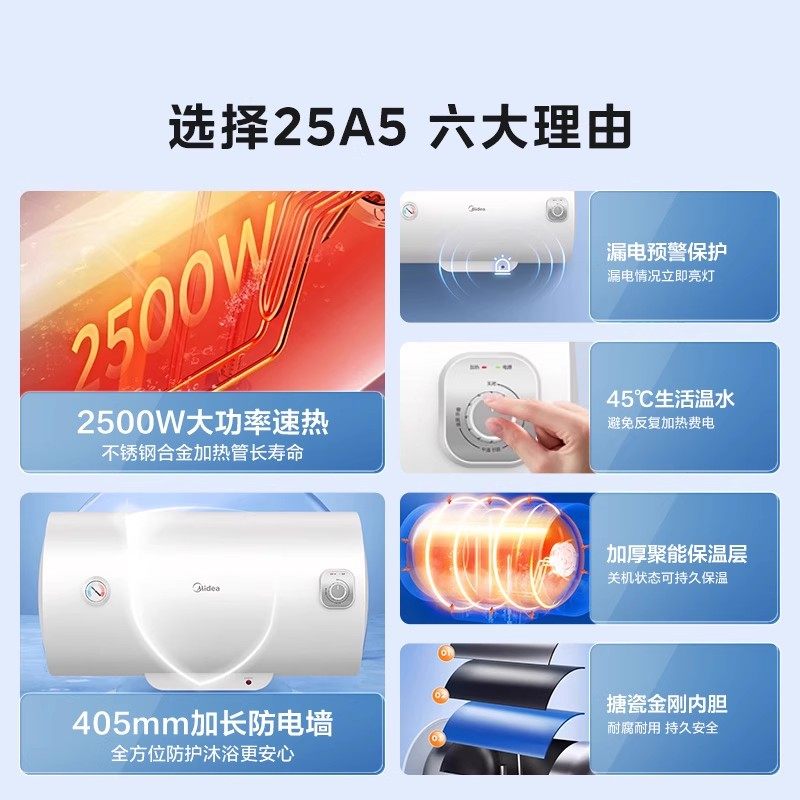 美的电热水器A5家用卫生间洗澡40升一级能效节能租房速热官方旗舰