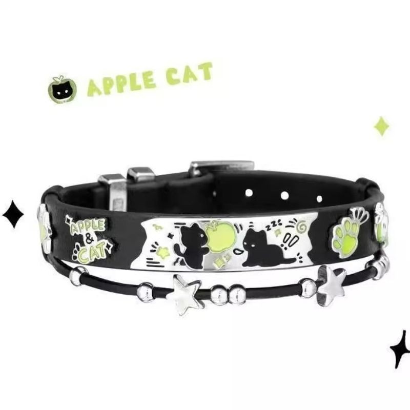 敲可爱!黑猫青苹果手链新款小众设计甜酷皮革手环手镯卡通设计感