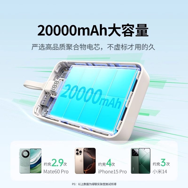 绿联3C认证充电宝20000毫安30W自带Type-C线快充移动电源苹果安卓