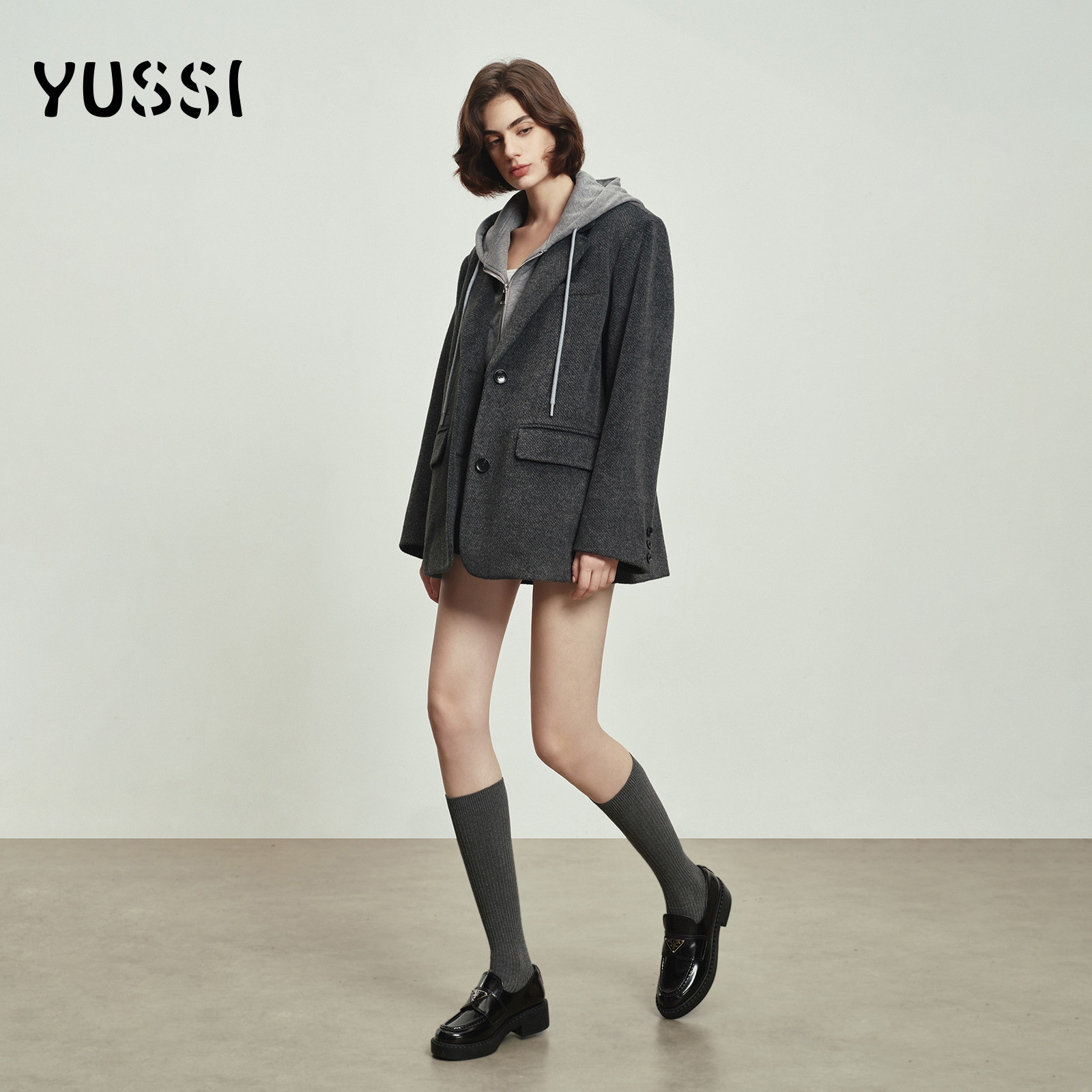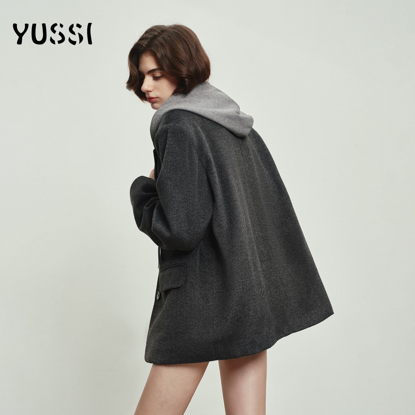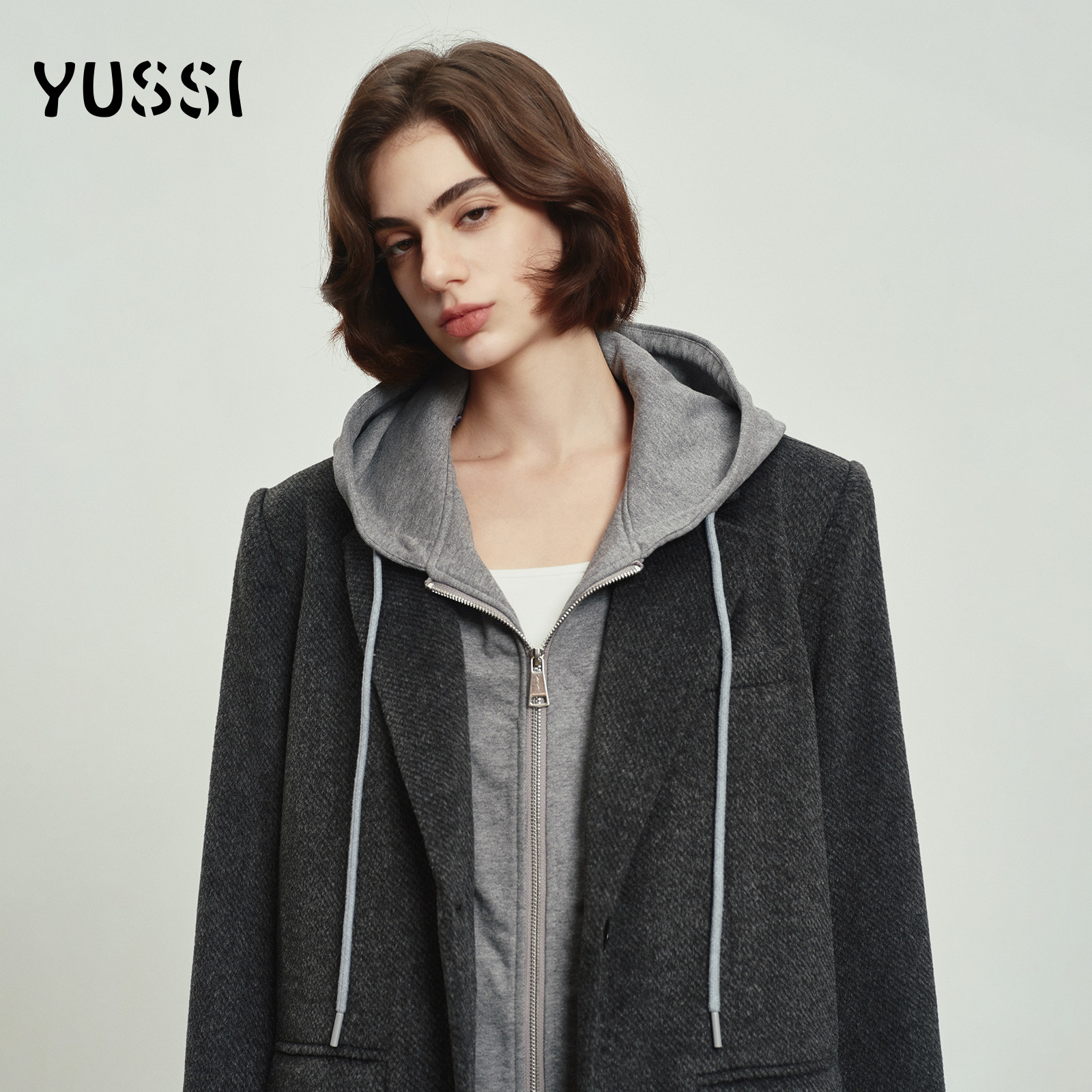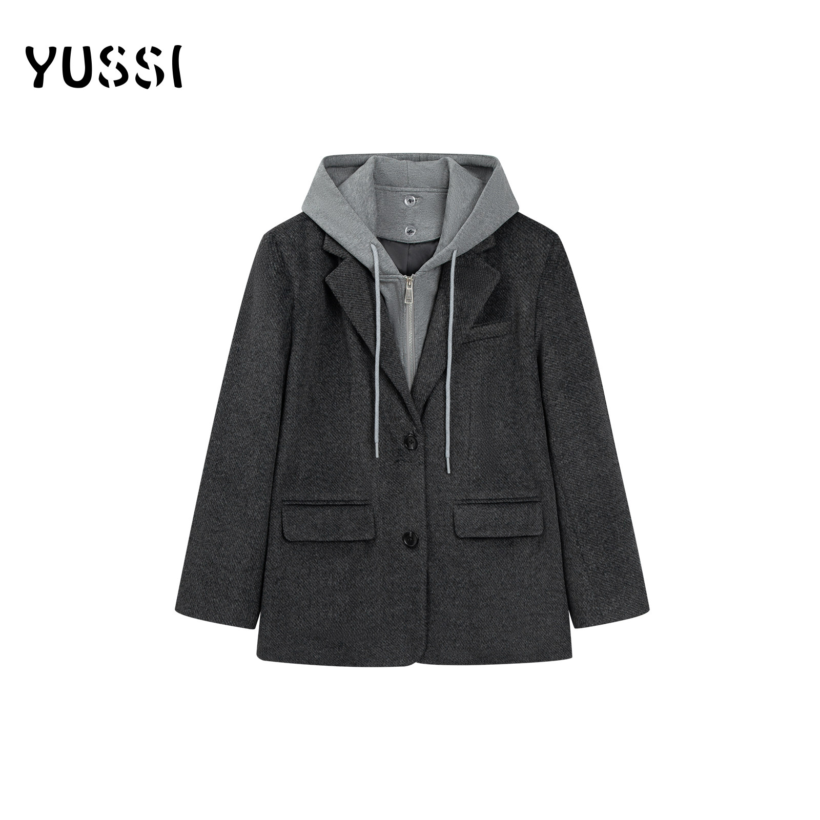 YUSSI高级感灰色西装呢子大衣女秋冬假两件连帽毛呢短款外套