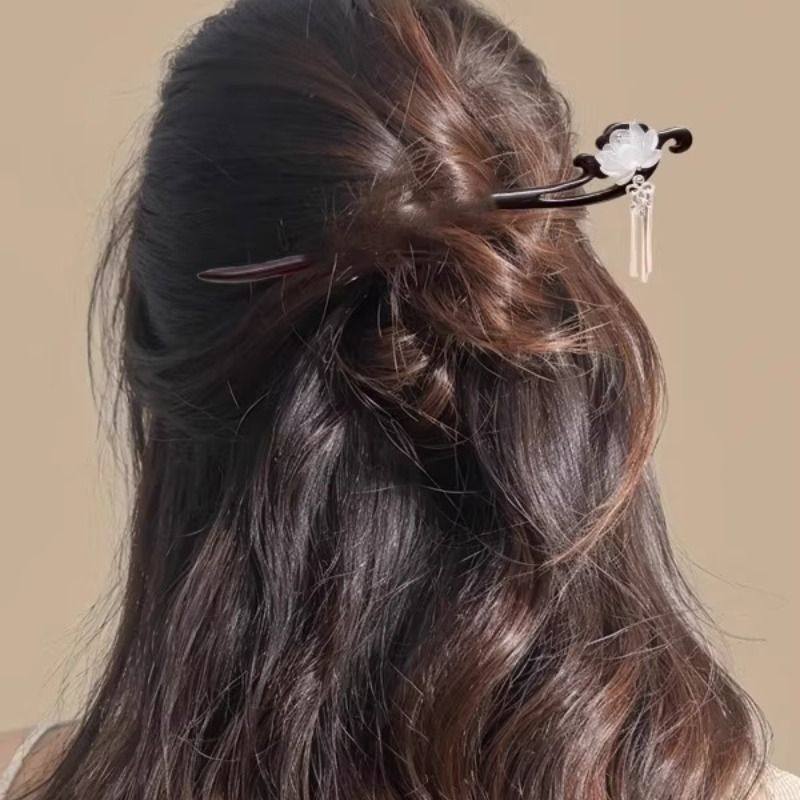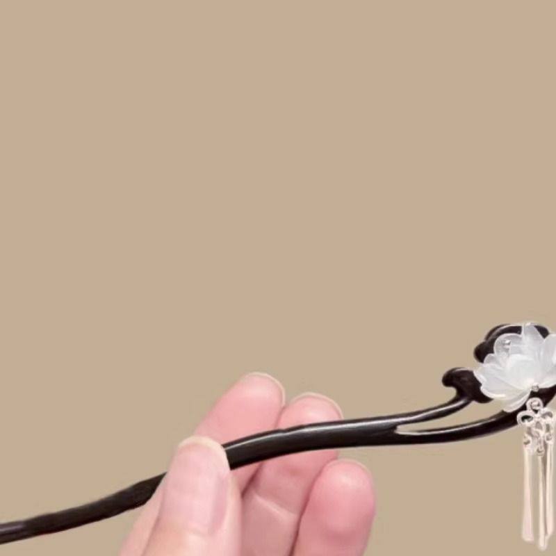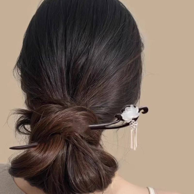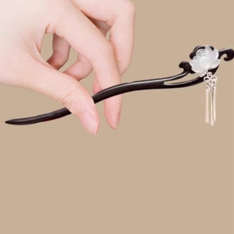 古风莲花檀木发簪女中式步摇流苏盘发簪子日常通勤感汉服头饰双面