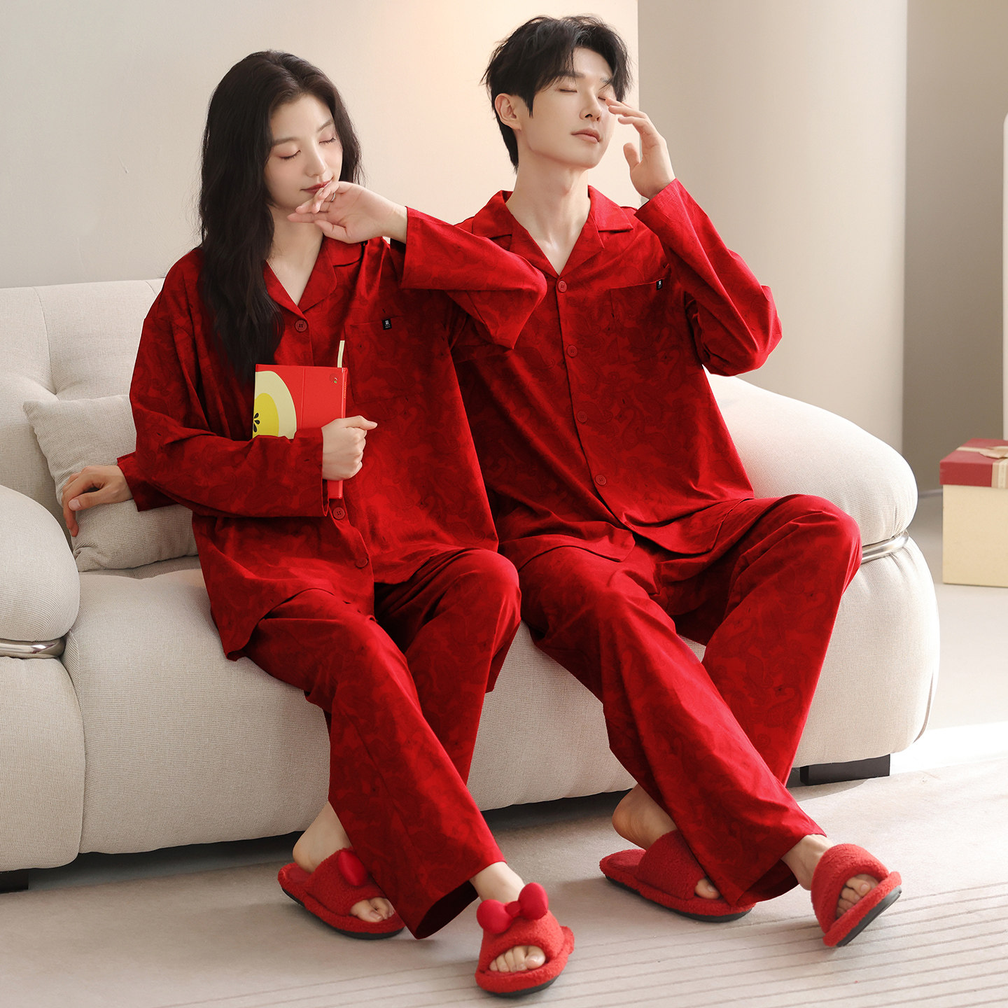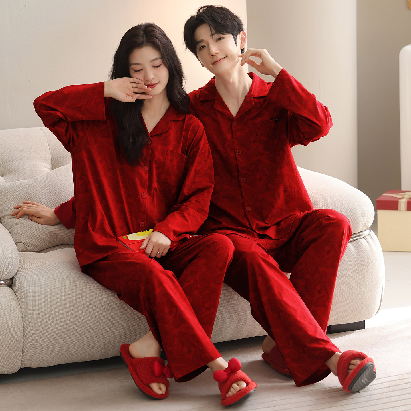 本命年结婚新婚秋冬大红色睡衣情侣翻领开衫长袖睡衣套装家居服