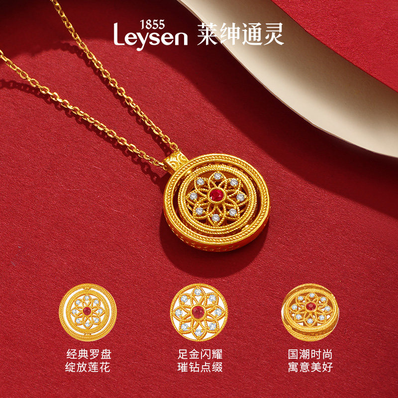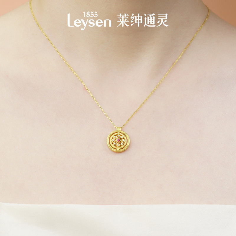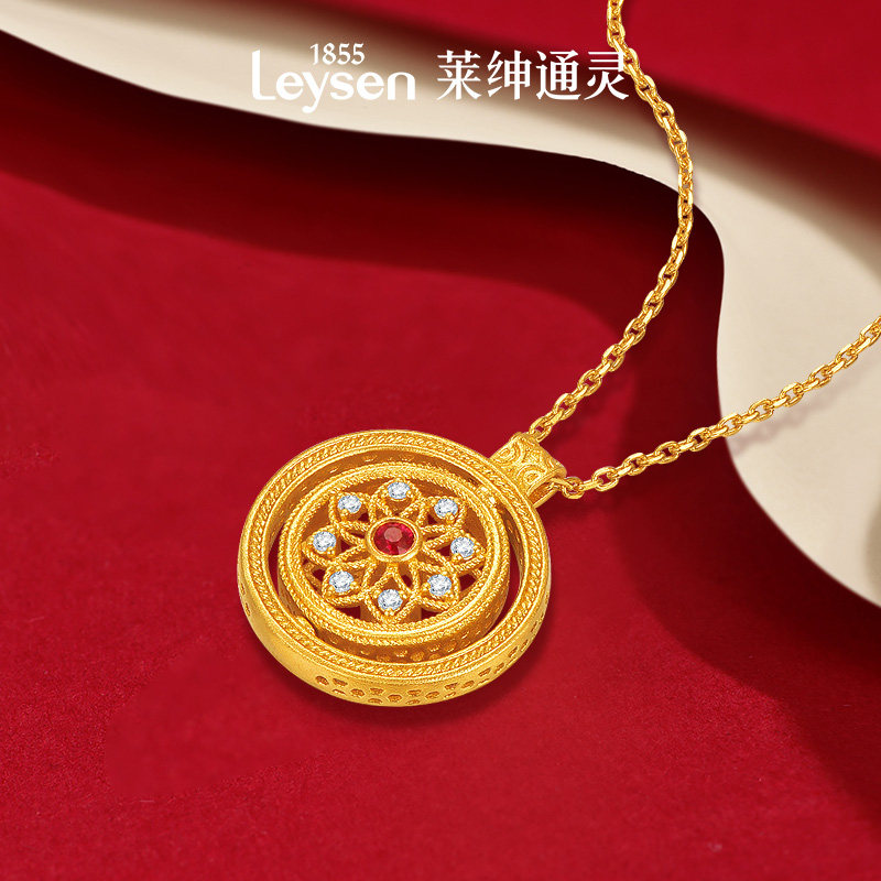 莱绅通灵 新经典系列莲花花窗八宝罗盘黄金足金999钻石红宝石项链