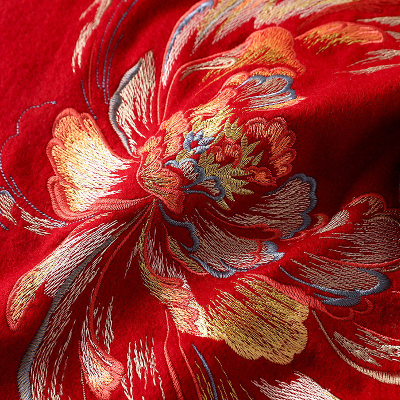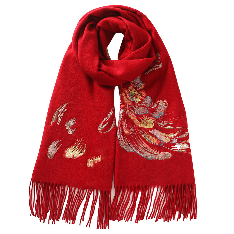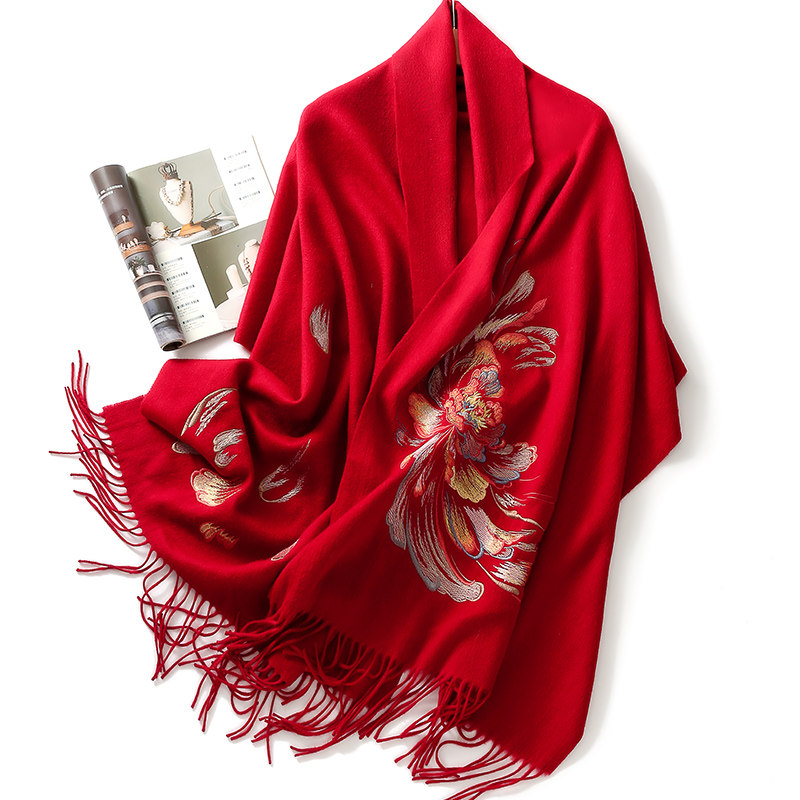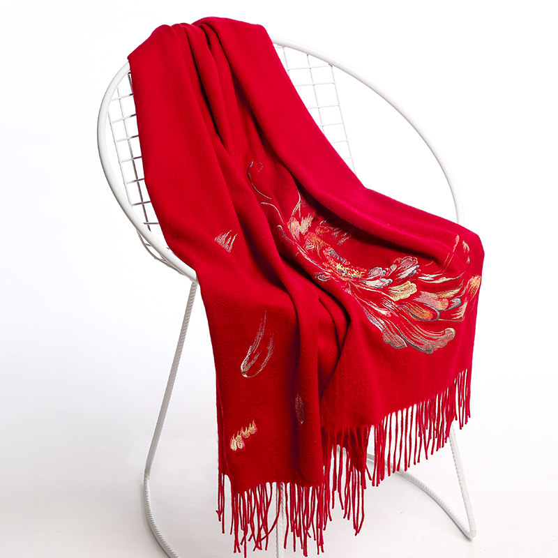 恒源祥绵羊毛围巾女刺绣妈妈大红色无羊绒大披肩中老年斗篷秋冬季
