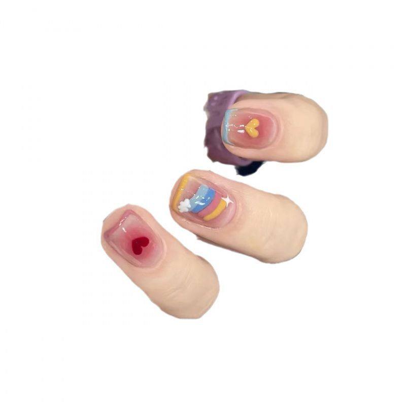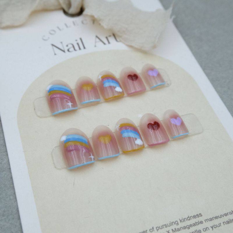 纯手工美甲穿戴甲假指甲贴片手绘ins可爱糖果色彩虹腮红法式爱心