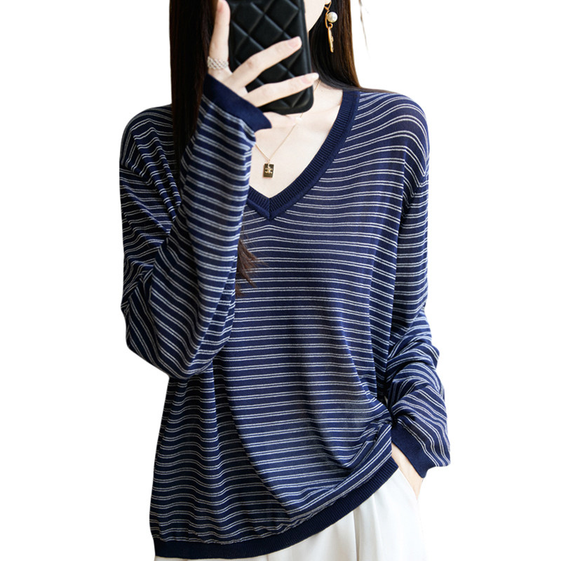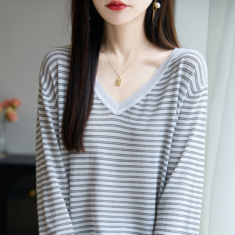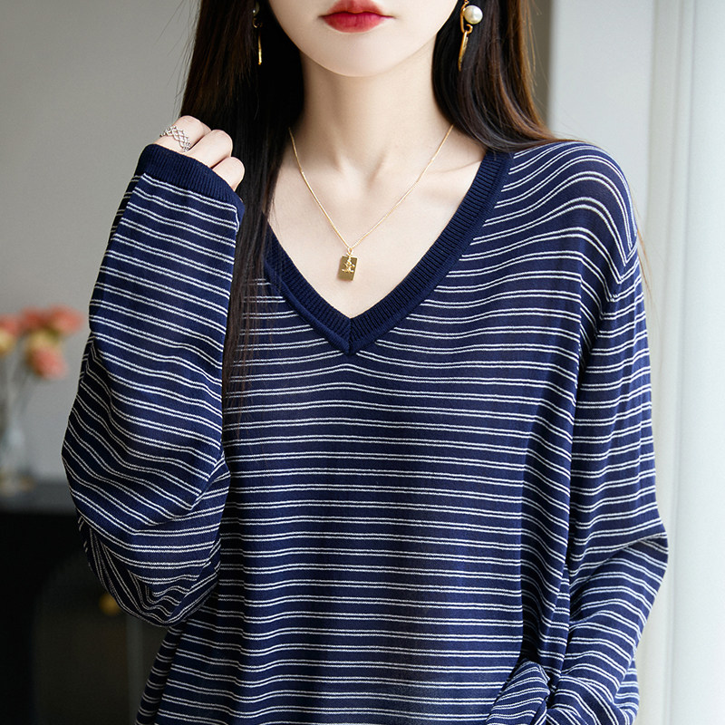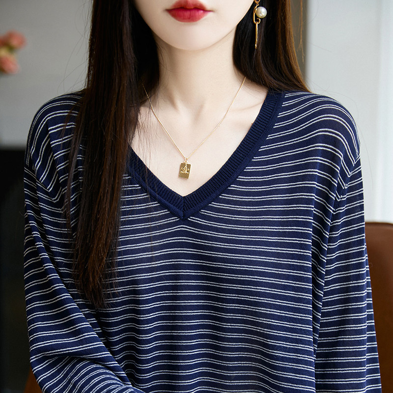 撤标撤柜(A)V领条纹针织打底衫女春秋上衣洋气大码女装秋冬毛衣