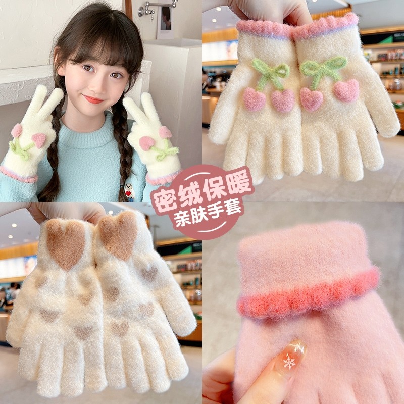 儿童手套秋冬季保暖五指套男女童加绒可爱卡通加厚毛绒手工爱心