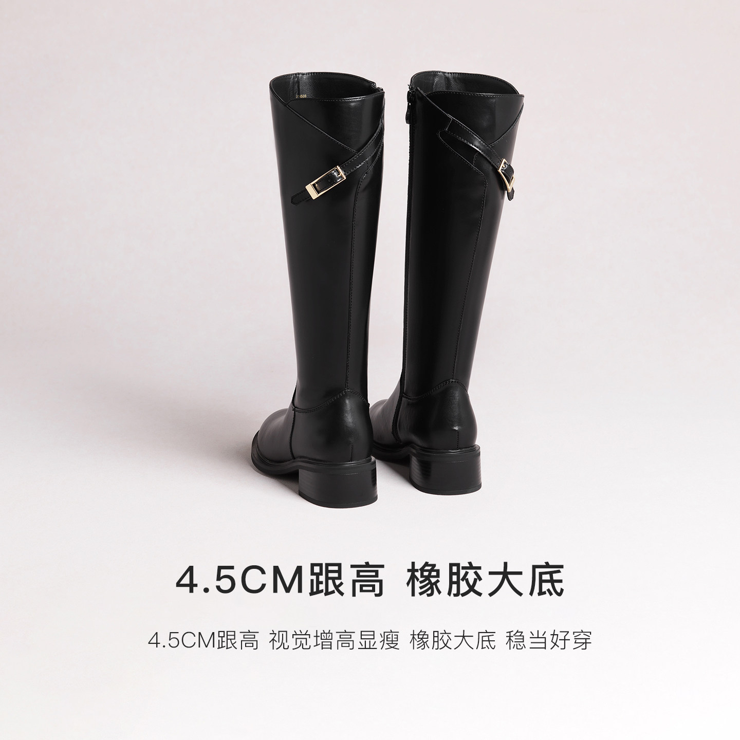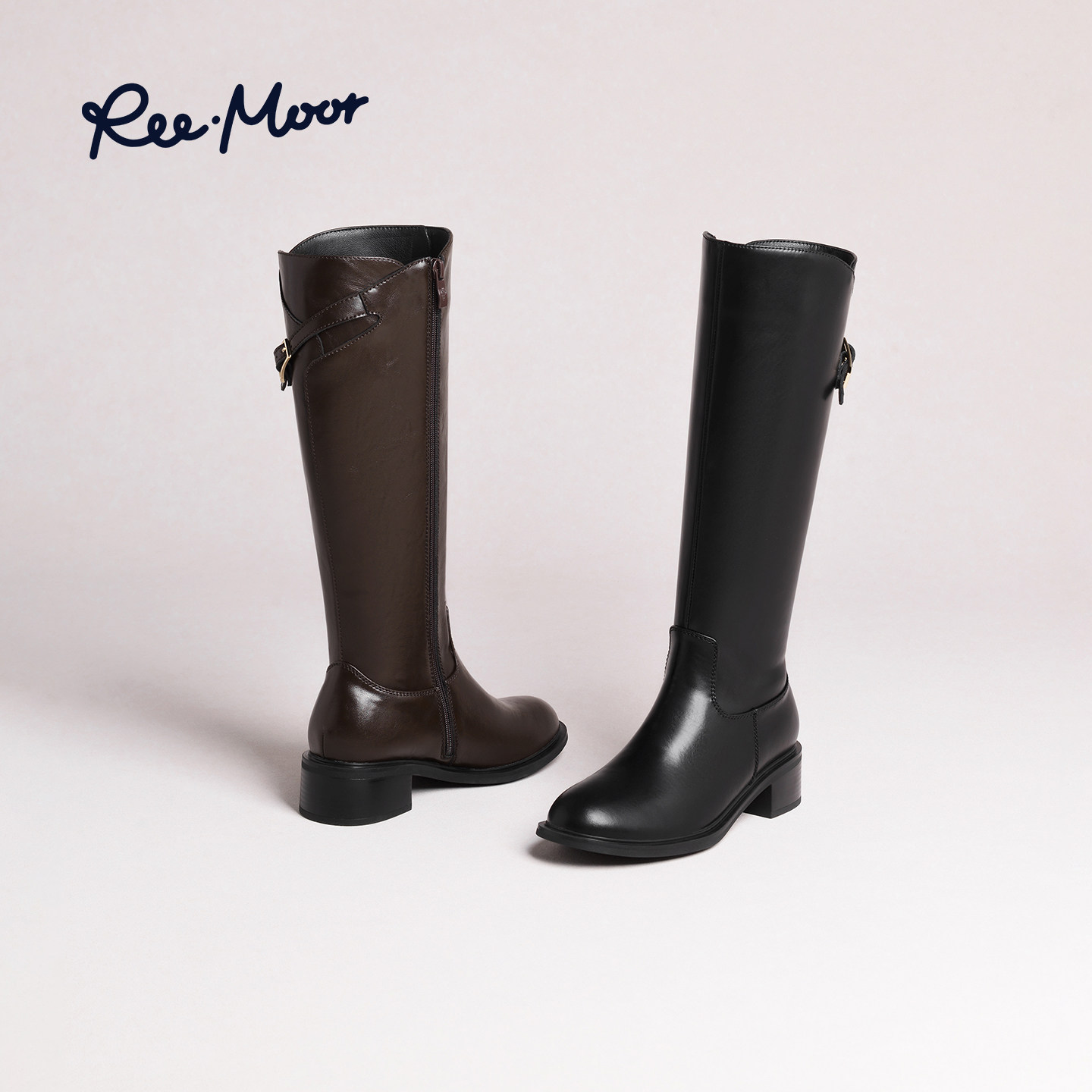 REEMOOR睿慕2025冬季新款皮带扣骑士靴女高筒粗跟后拉链机车靴