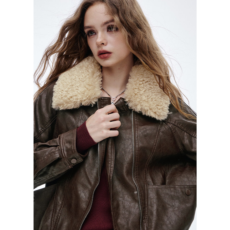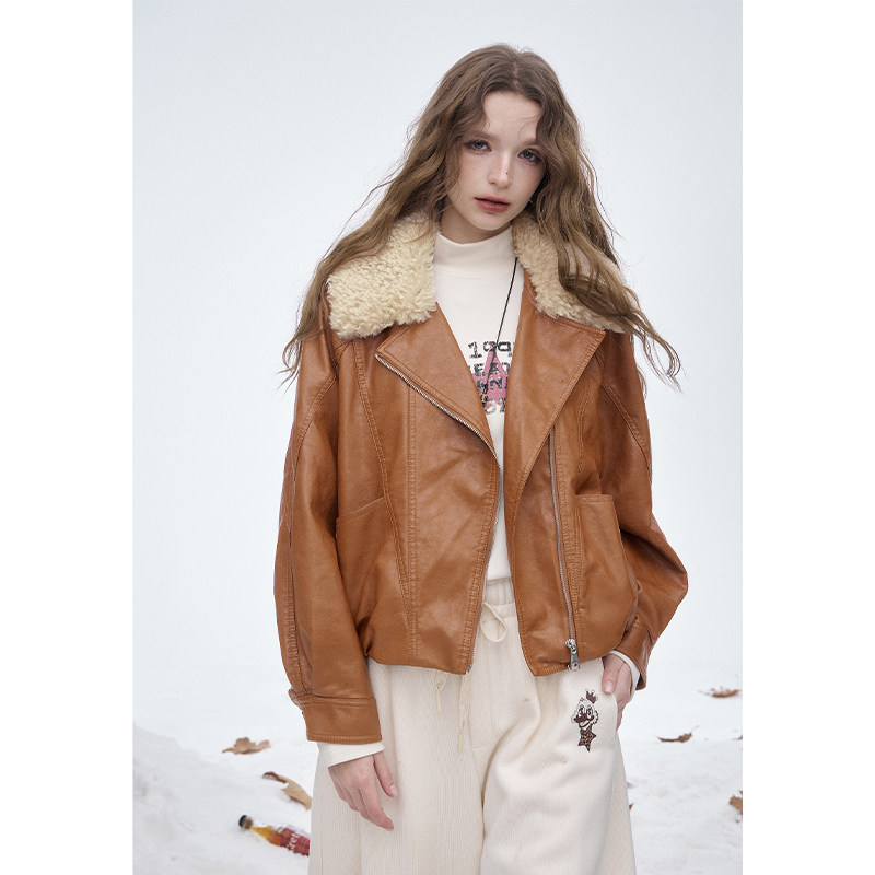 妖精的口袋大毛领咖色皮衣外套女2025年秋冬新款高级感保暖皮夹克