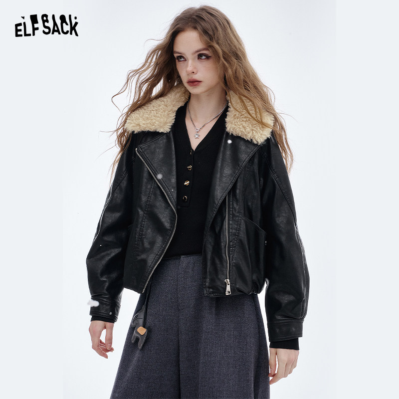 Eland衣恋皮衣女纯色带拉链长袖翻领外套2025冬季新款