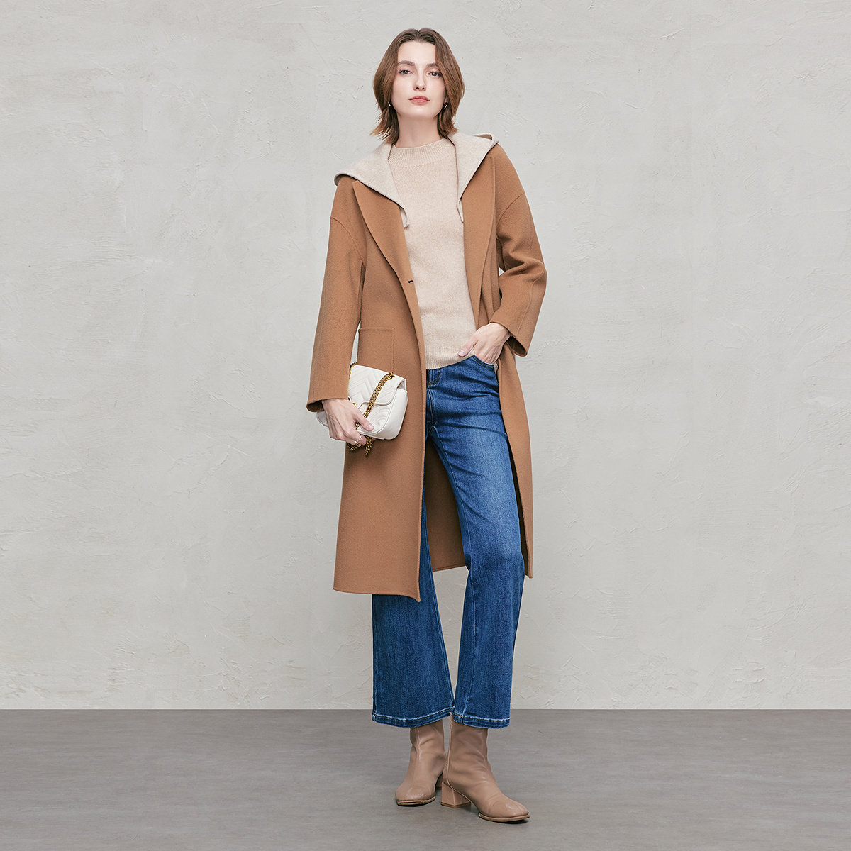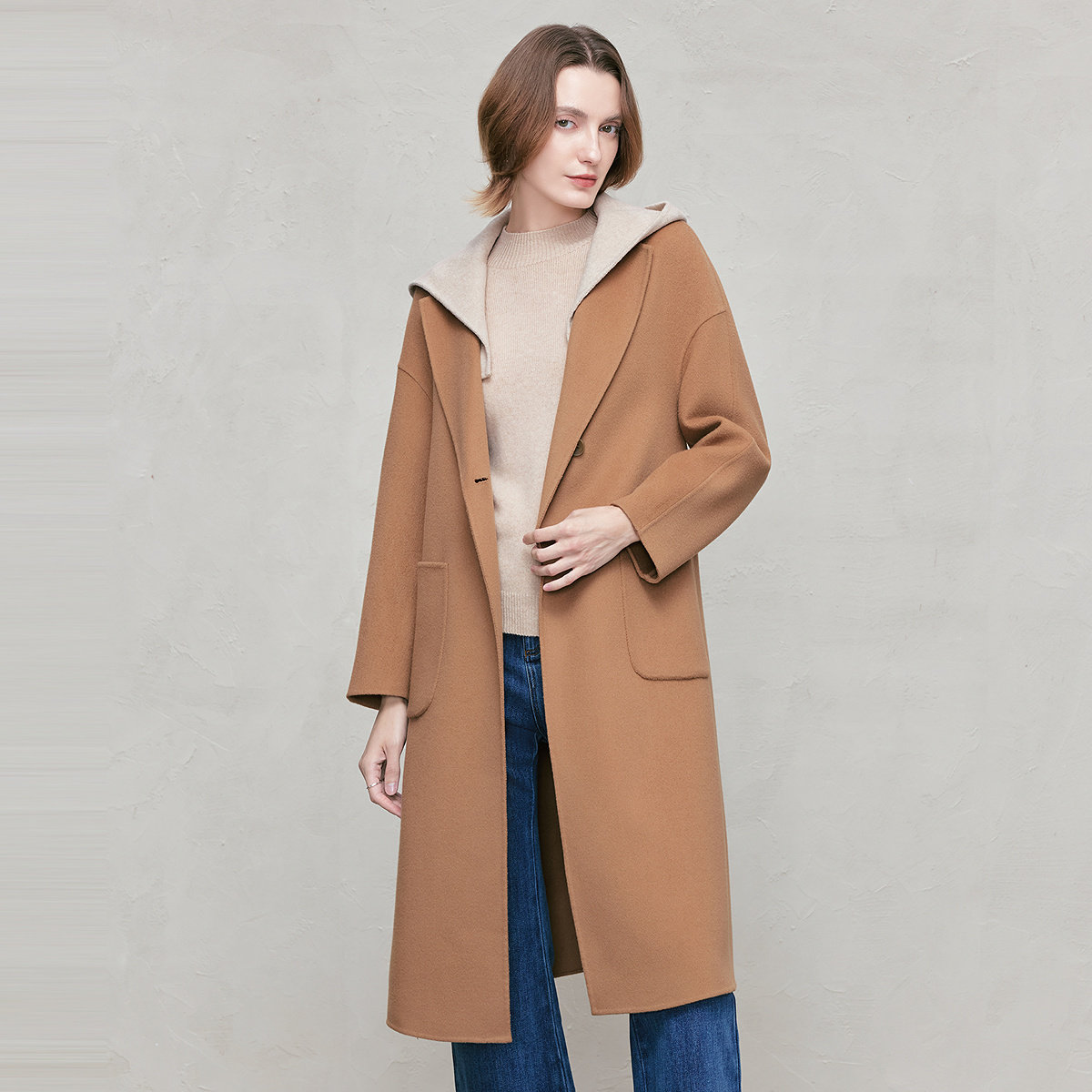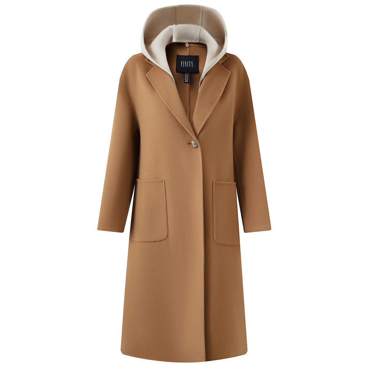 FINITY菲妮迪毛呢外套2026年春季新款驼色双面呢长款羊绒大衣女士