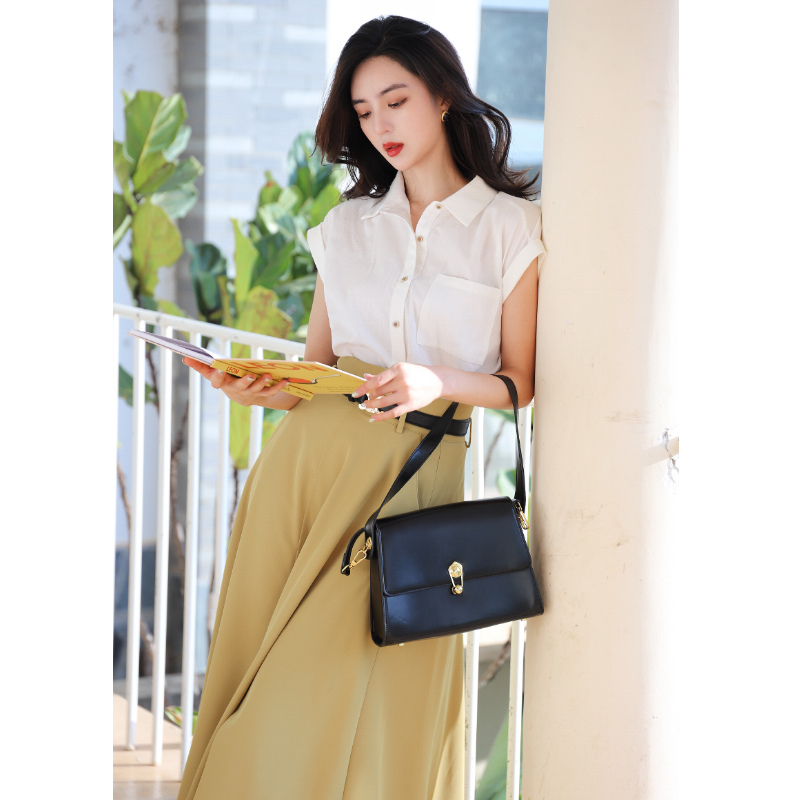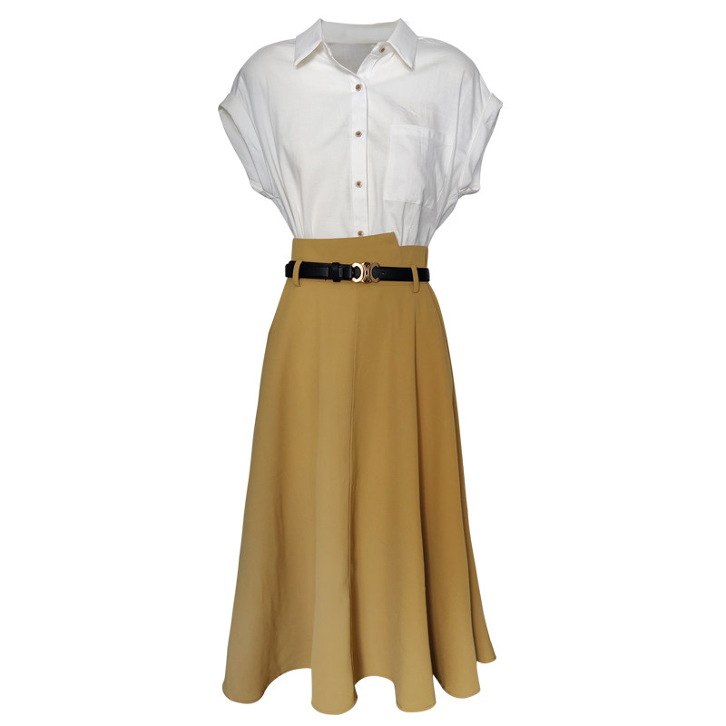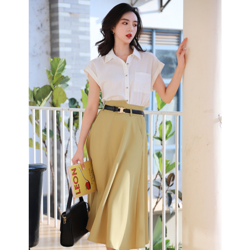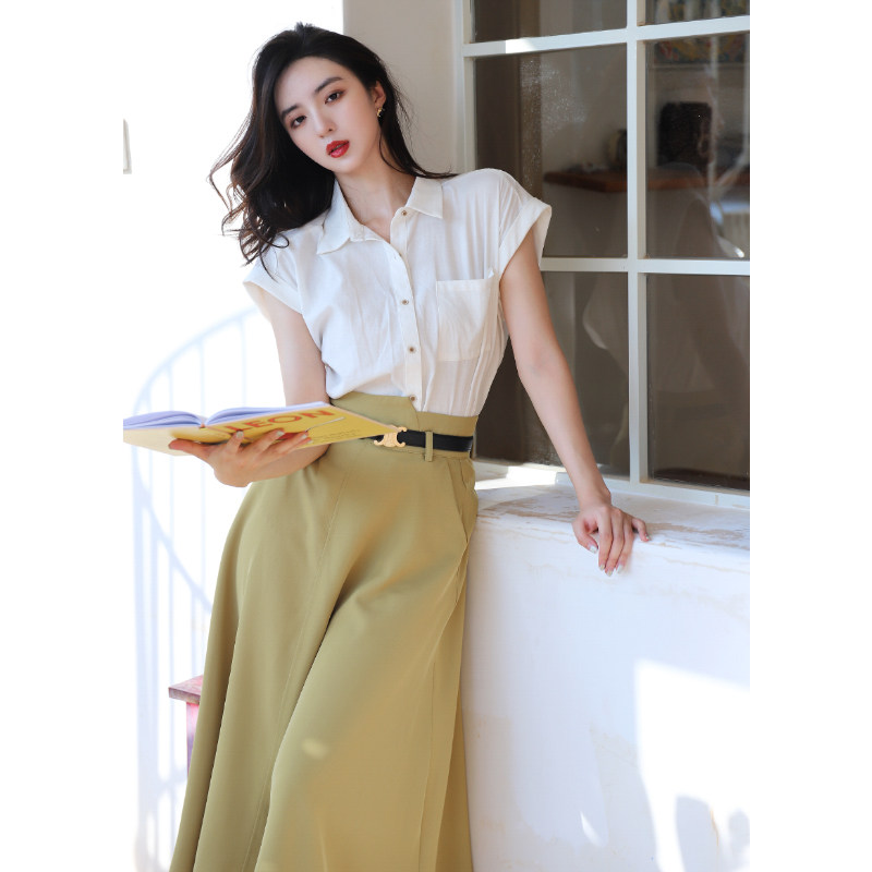 夏季白色上衣法式复古宽松衬衫收腰大摆伞裙半身裙简约气质套装女
