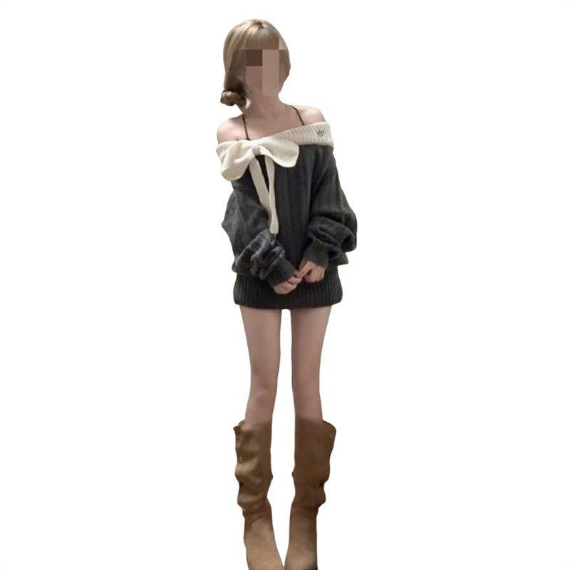 法式蝴蝶结一字肩针织连衣裙女秋冬2025新款大码内搭漂亮包臀裙