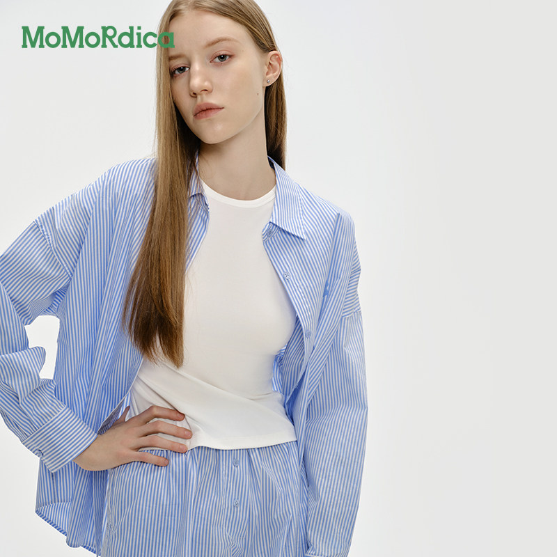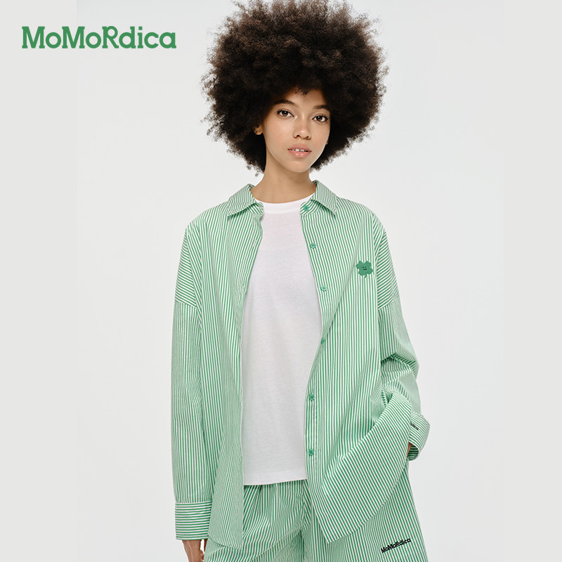 【清仓】Momordica新款2025秋季条纹衬衫翻领绣花宽松衬衣长袖薄