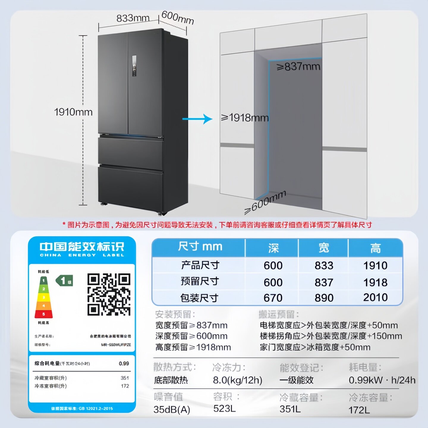 Midea/美的 MR-550WUFIPZE自动制冰家用双系统法式门嵌入式冰箱