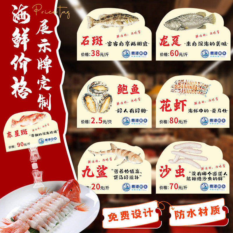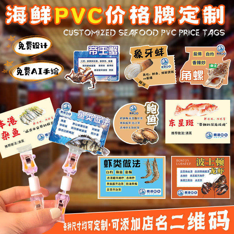 海鲜菜品展示卡定制水产帝王蟹龙虾鲍鱼介绍牌餐饮价格标签牌pvc防水标识牌火锅自助餐烫煮提示牌小卡片订做